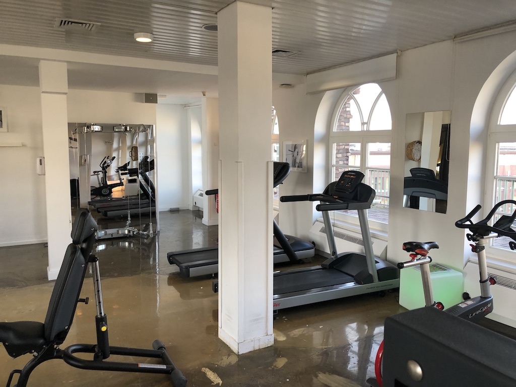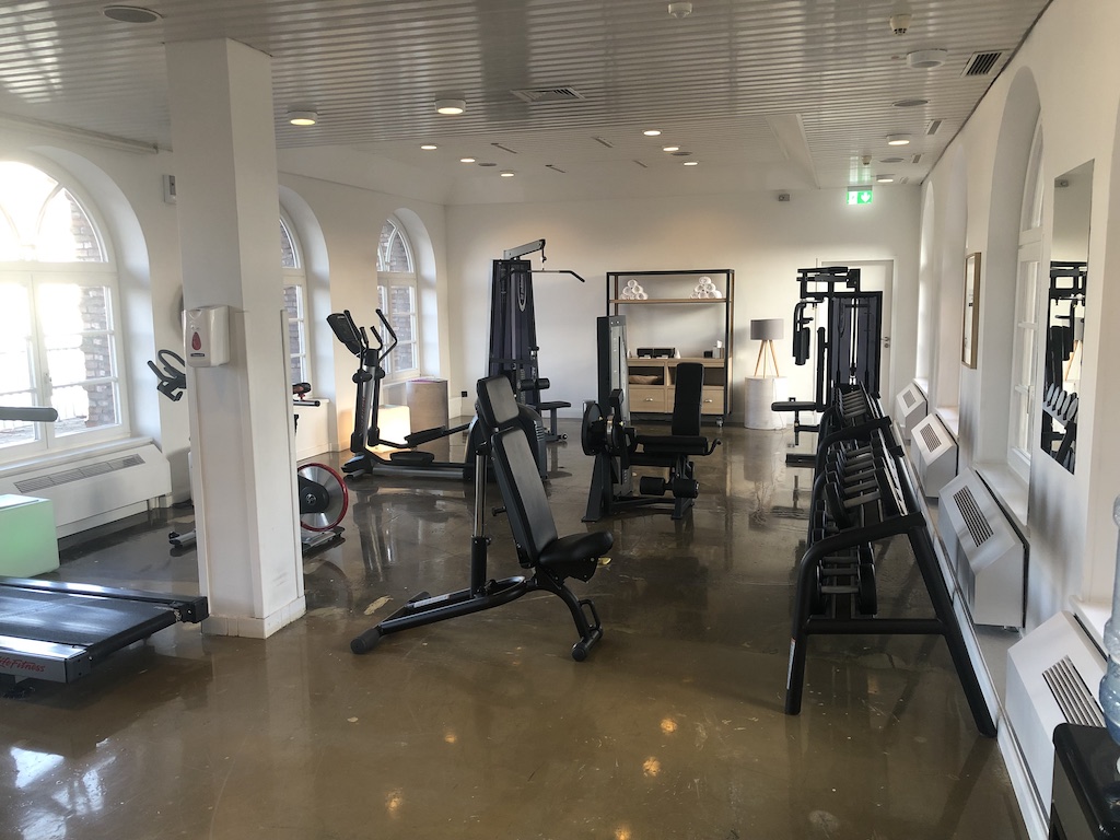 In der obersten Etage befindet sich ein Fitnessraum. Die Cardiogeräte, Kraftmaschinen und Hanteln sind in einem außergewöhnlichen Zimmer untergebracht.
