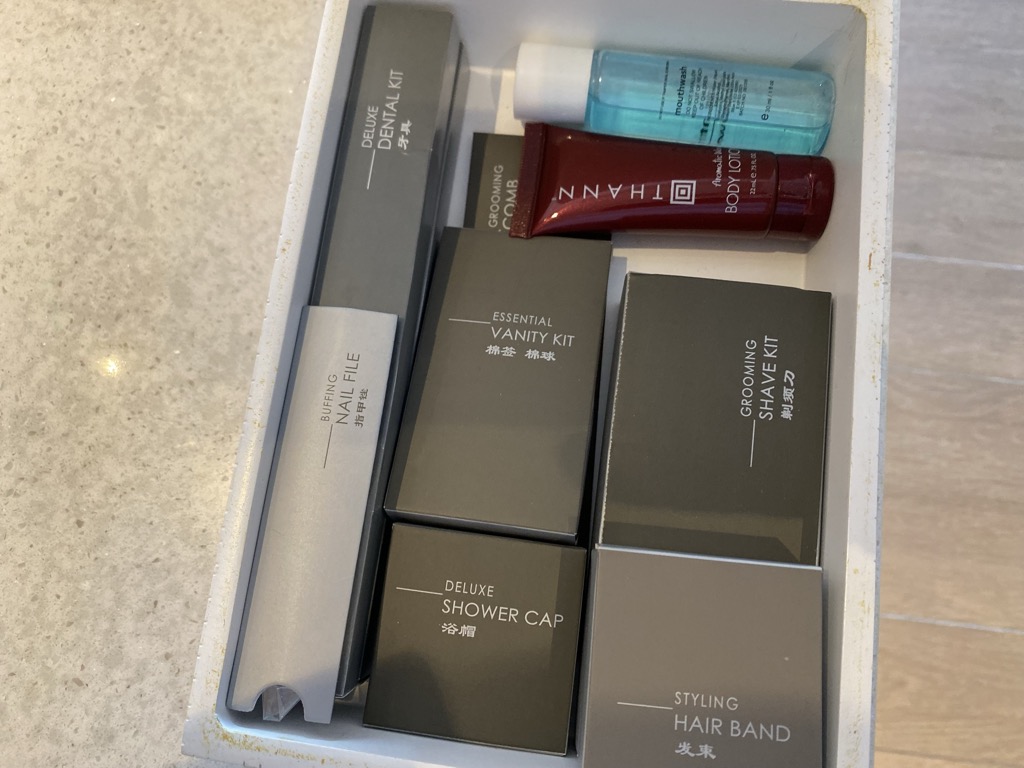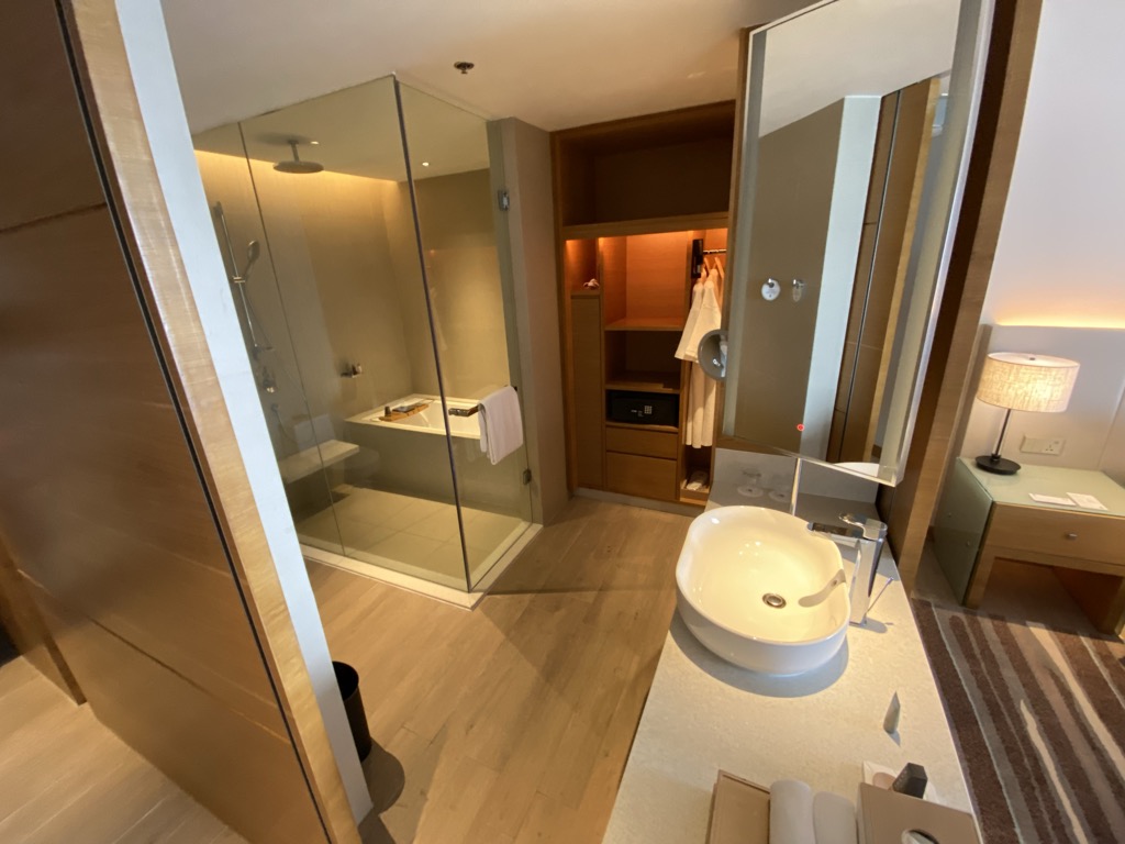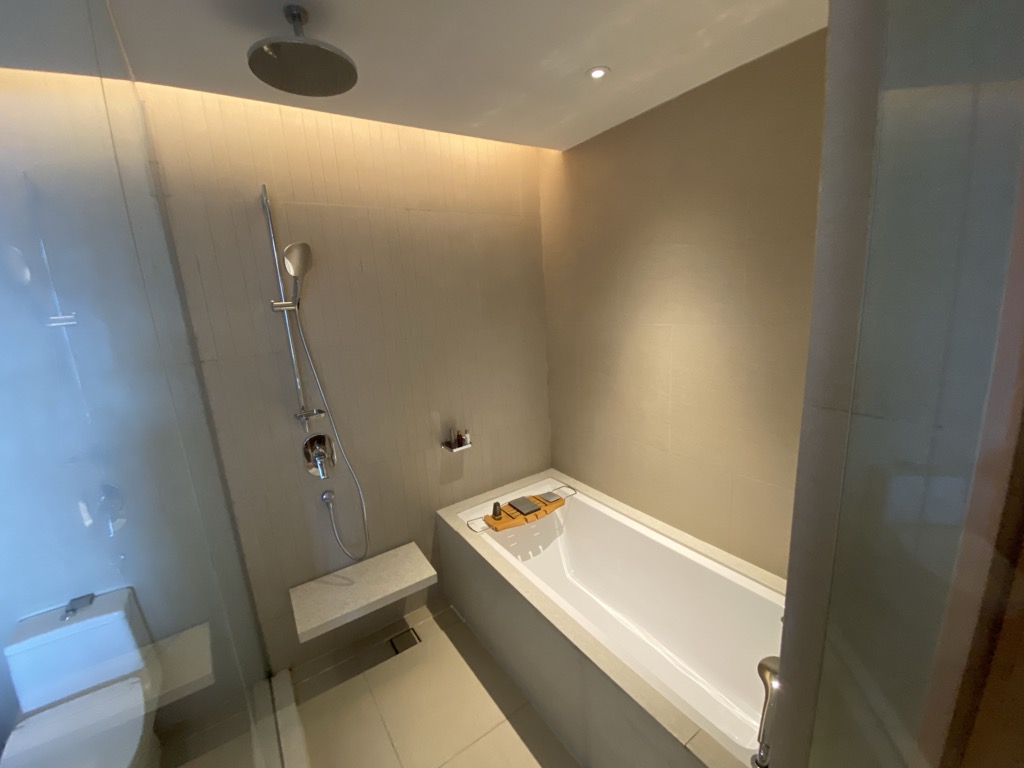 Nach dem Betreten des Zimmers befand sich auf der linken Seite ein sehr offen gehaltenes Bad, welches mit einem großzügigen Waschbecken, einer Toilette, eine Badewanne und einer Dusche ausgestattet war. Hier erwartete uns eine vollständige Auswahl Amenities.