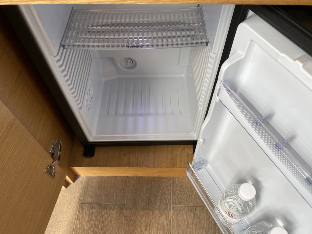 An der großen und hellen Fensterfront des Zimmers stand eine Couchecke, hier erwartete uns auf dem Beistelltisch bereits ein Obstteller. Neben der Sitzgruppe befand sich eine Kaffee- und Teestation, auf welcher auch Wasser stand. Ein Kühlschrank war hier auch verbaut, dieser war allerdings leer.
