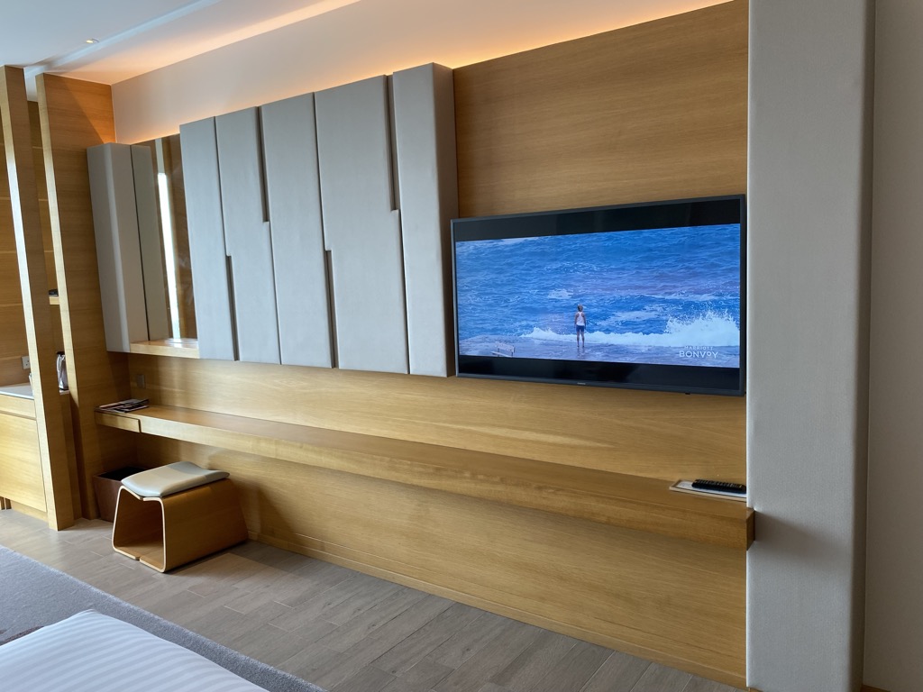 Gegenüber des Bettes war ein großer Fernseher montiert.