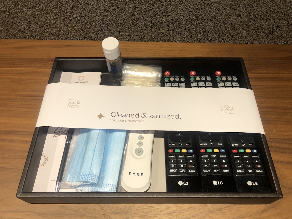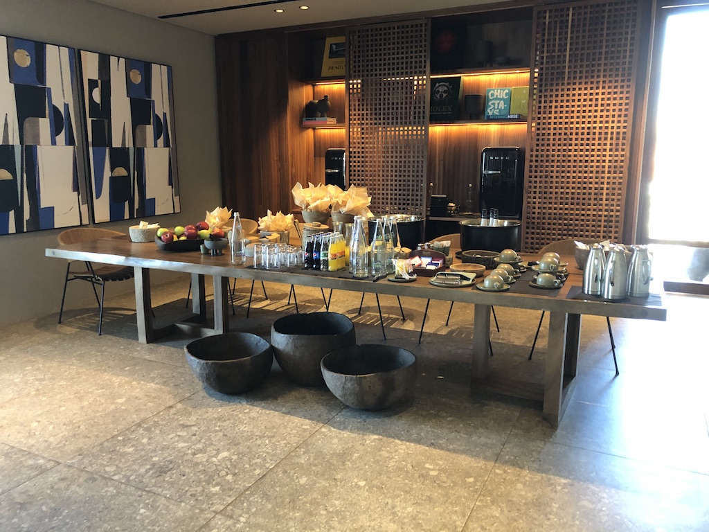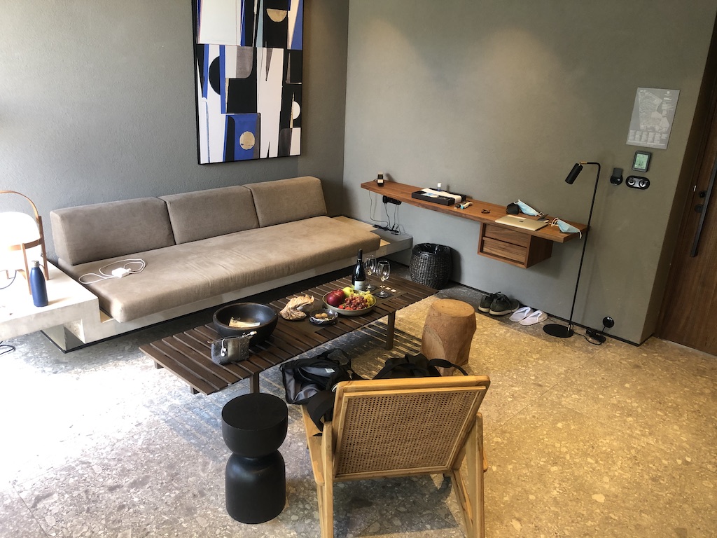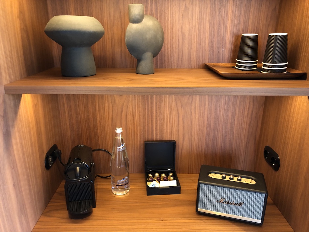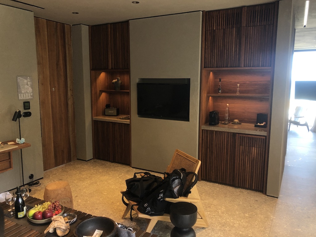 Die weiden Räume waren mit einem Wohnzimmer in der Mitte abgetrennt. Dort gibt es einen weiteren Fernseher, Nespresso-Maschine, ein Bluetooth-Radio und Minibar. Diese war bestückt, die erste Beladung war sogar kostenfrei! Die Minibar wurde auch nur auf Wunsch (dann gegen Gebühr) wieder aufgefüllt um Kontakte niedriger halten. Das Housekeeping wurde deswegen auch nur für jeden zweiten Tag angekündigt, das Zimmer wurde dennoch täglich gereinigt.