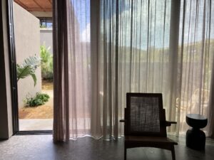 In karger und etwas trister Umgebung liegt das Domes Zeen. Auf der Terrasse dann ein unerwartet positiver erster Eindruck der Anlage. Es ist zwar innen wie außen viel Beton zu sehen, das Resort wurde aber erst im vergangen Jahr eröffnet und wird vielleicht im Laufe der Zeit etwas grüner. Abzug gibt es für die Unterkünfte, die trotz der Terrasse oder des eigenen Pools wenig Privatsphäre bieten. Vereinzelt liegen Schläuche und Kabel herum, ein wenig mehr Liebe zum Detail könnte den Gesamteindruck positiver gestalten.
