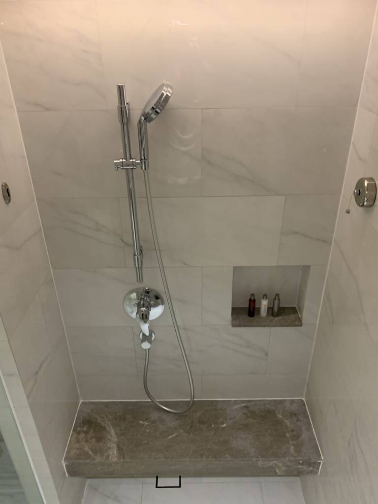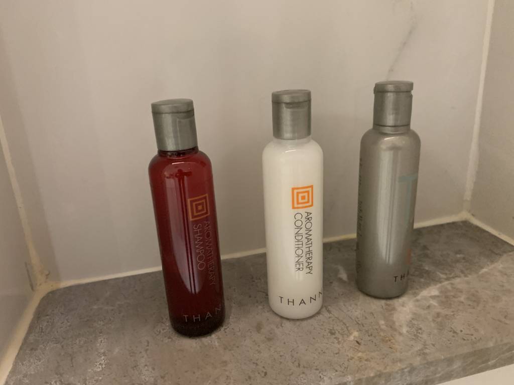 Das Badezimmer der M Club Suiten ist riesig und dient gleichzeitig als Ankleidezimmer, da sich hier auch der Kleiderschrank mitsamt Bügelbrett und Bügeleisen befindet. Auch den Safe findet man hier in einem weiteren Schränken versteckt. Neben einer großen freistehenden Badewanne, die neben dem Waschtisch steht, gibt es noch eine große Dusche. Die Dusche ist mit einer Handbrause und einer Regendusche ausgestattet. Neben den klassischen Pflegeprodukten von Thann gab es diverse weitere Amenities wie Badesalz und Zahnbürsten.