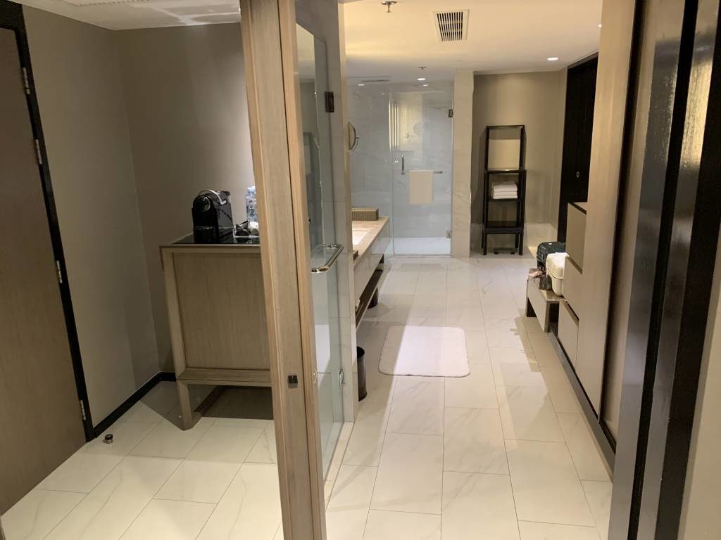 Alle M Club Suiten des Marriott Marquis Bangkok sind echte Suiten. Sie haben also ein Wohnzimmer und ein Schlafzimmer. Beide Räume sind miteinander verbunden. Alternativ kann man auch vom Flur durch das Bad ins Schlafzimmer gehen.