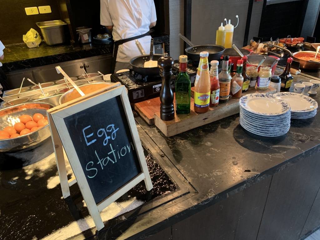 An einer Eier-Station werden frische Omelettes oder auch Eggs Benedict zubereitet. Im westlichen Frühstücks-Bereich gibt es Brot und Brötchen, sowie Wurst und Käse. Auch Würstchen, Speck und Bohnen sind am Büffet erhältlich. Darüber hinaus gibt es aber auch asiatische warme Gerichte, etwas Obst, Salat und Frühstücks-Cerealien.