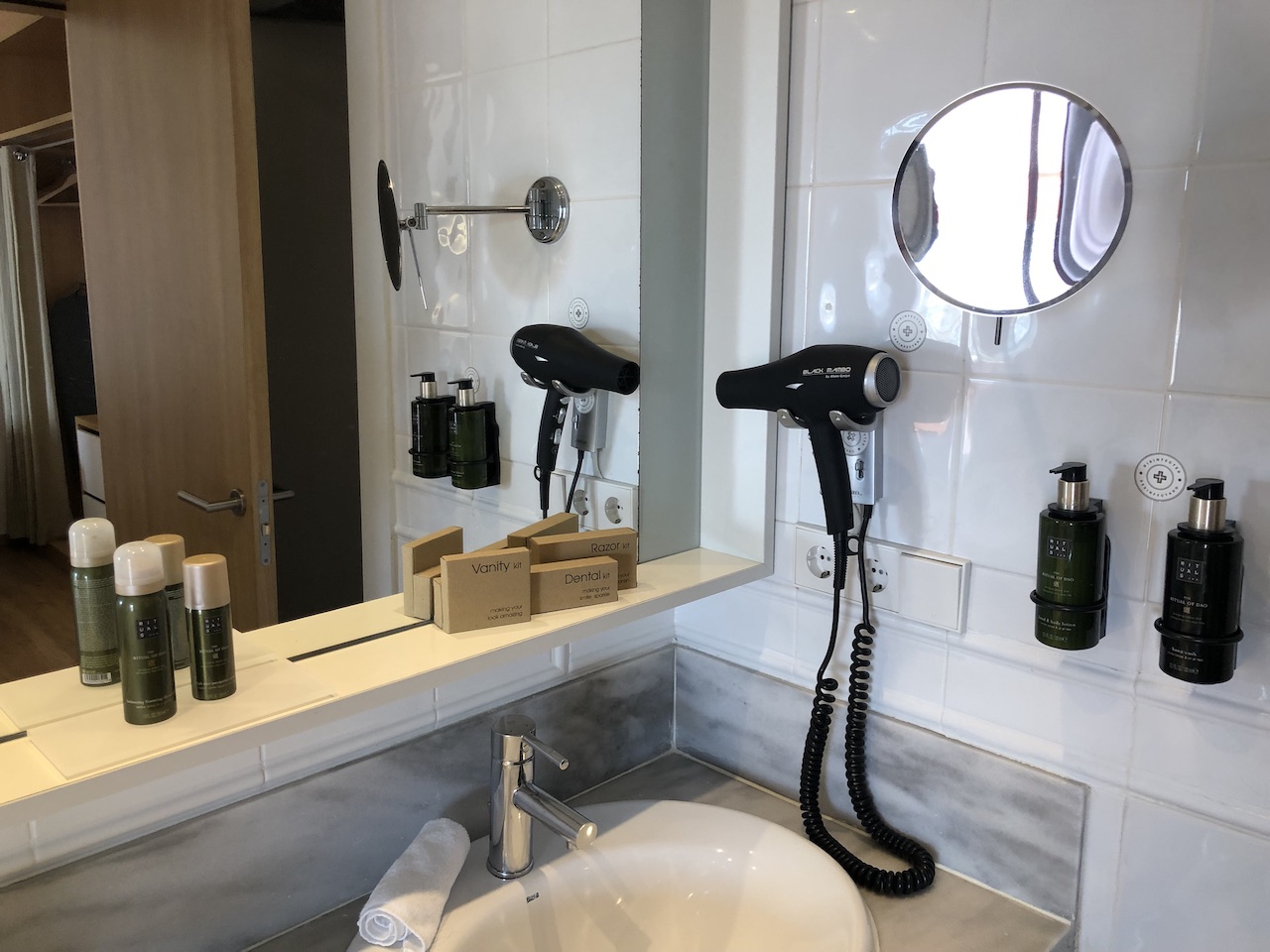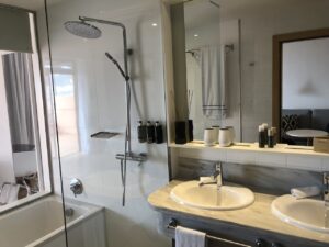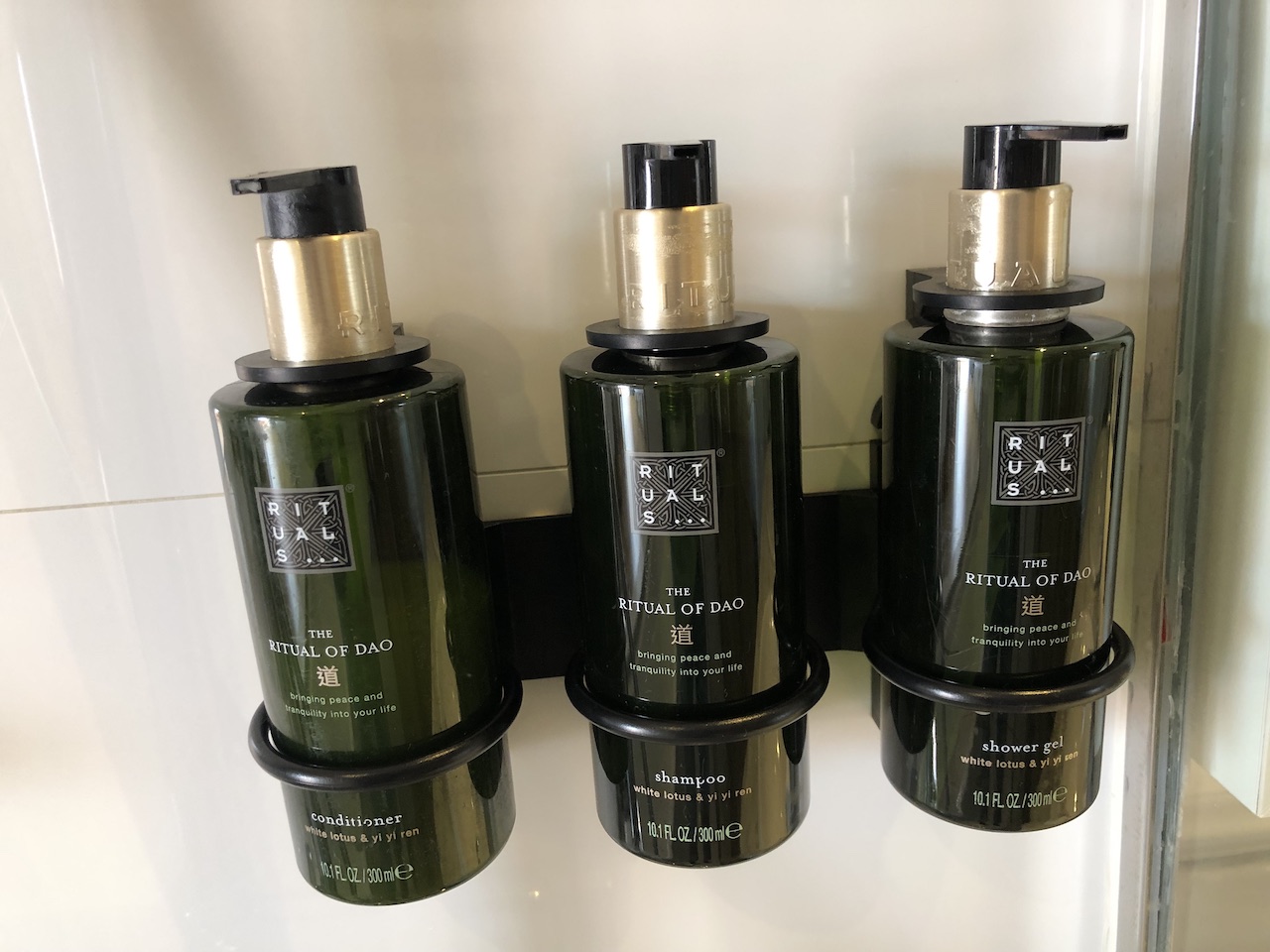 Das Badezimmer selbst ist klein, aber praktisch. Neben einer bodentiefen Dusche ist auch eine Badewanne vorhanden. Eine große Fensterscheibe gibt den Blick auf das Zimmer und die Terrasse frei. Seife, Duschgel und Bodylotion von „Rituals of Buddha“ waren in Form von Spendern sowohl am Waschbecken, als auch in der Dusche vorhanden.