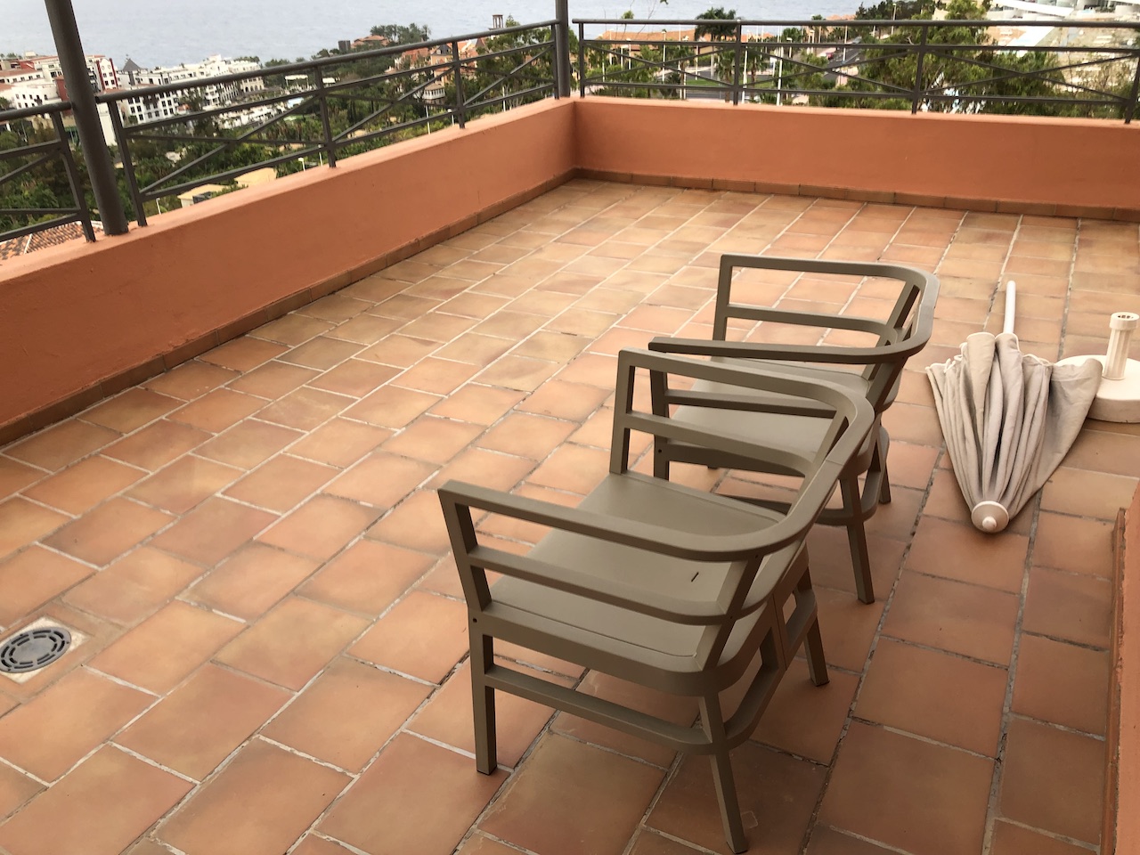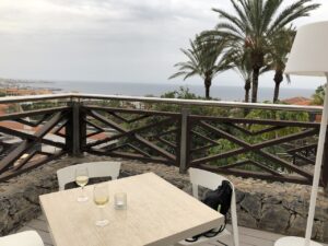 Die Terrasse ist sehr großzügig und offen. Der Blick auf die Hotelanlage, Playa de las Américas und das Meer ist vor allem zur Abendstunde schön. Leider waren die Sonnenliegen und der Sonnenschirm abgenutzt und lieblos abgestellt worden. Der von uns sehnlichst erwartete Jacuzzi hatte schon bessere Zeiten gesehen. Der Wasserstrahl, der sogenannte „Jet“, sowie die Whirpoolfunktion versagten ab und zu.