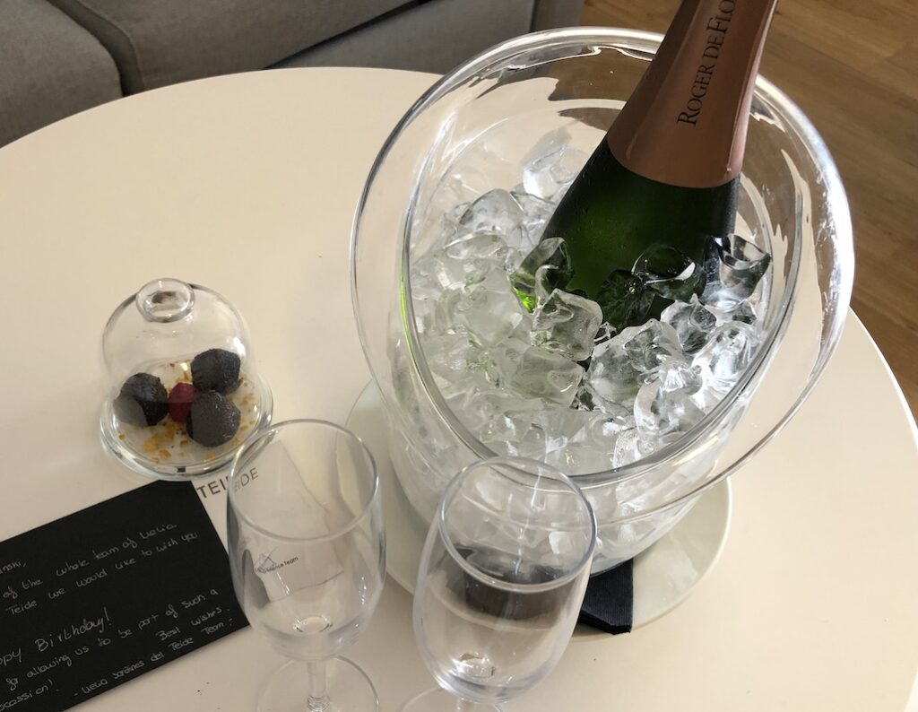 Als Annehmlichkeit zur Begrüßung kamen eine Flasche Weißwein und ein Teller Tapas aufs Zimmer. Wir hatten auch einen Geburtstag gefeiert und gleich eine weitere Flasche Cava mit einer Karte zugestellt bekommen.