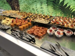 Auch das angebotene Buffet hätte zum Sattwerden gereicht. Allerdings waren die warmen Komponenten schnell vergriffen – und oft gerade einmal lauwarm. Die Auswahl an kalten Häppchen und süßen Speisen war indes enorm.