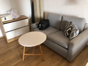 Ein Schreibtisch dient als Raumtrenner zwischen dem Flur mit der Garderobe und dem restlichen Zimmer. Eine kleine Sitzecke ist ebenfalls vorhanden.