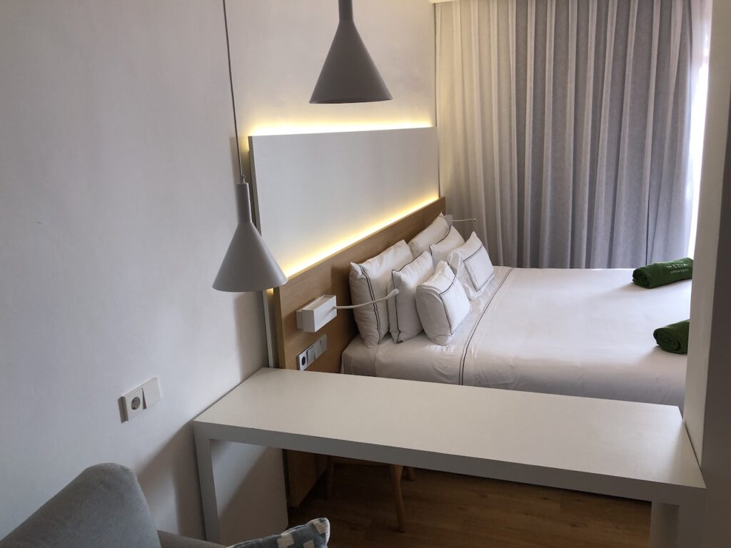 Unser Zimmer war im obersten Stockwerk des Hotels gelegen. Die in weiß gehaltene Einrichtung und die große Fensterfläche machte das Zimmer hell – was aber auch an der dachlosen Terrasse liegen mag.