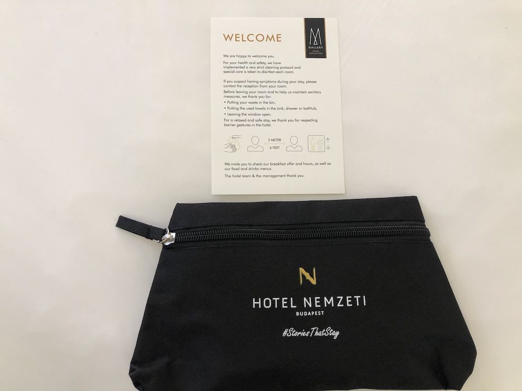 Auf dem Schreibtisch lag ein persönliches, mit der Hand gefertigtes Schreiben zur Begrüßung und auf dem Bett ein Hygiene-Kit. Darin enthalten: Gesichtsmaske, Einweghandschuhe und Desinfektionsmittel.
