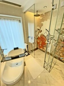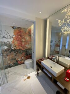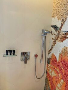 Das Badezimmer bietet eine geräumige Dusche, eine Toilette in einer Glaskabine und eine freistehende Badewanne – sogar mit Nackenrolle. Die Dusche ist ebenfalls in einer Glaskabine und teilt sich eine Glaswand mit der Toilettenkabine. Von daher mag das nicht jedermanns Geschmack treffen. Der Bereich am Waschtisch ist groß genug, die meisten Kulturartikel direkt dort abzustellen. Insgesamt fällt das Bad sehr chic, hell und groß aus. Das geflieste Mosaik an der langen Wand in der Dusche/Toilette sieht dabei spektakulär aus und macht deutlich, dass es sich um ein Design Hotel handelt.