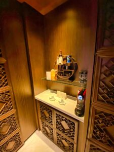 Gerade der Eingangsbereich wirkte in meinem Zimmer sehr dunkel. Das wird wahrscheinlich auf alle Zimmer, die linker Hand vom Aufzug liegen zutreffen. Durch einen kurzen Gang steuerte ich immer direkt auf eine braune Holzwand zu, in der einer der beiden Kleiderschränke versteckt war. Rechts davon, noch an der Wand vom Eingangsflur befindet sich die Minibar. Die Preise waren etwas gewöhnungsbedürftig. Während Softdrinks vielleicht einen HKD (ca. 0,12 EUR) teurer waren als in den 7-11 Läden, kostete eine kleine Tüte Chips das Fünffache. Neben der Minibar standen auch zwei Flaschen Wasser, die täglich gratis neu gebracht wurden und eine Nespressomaschine.