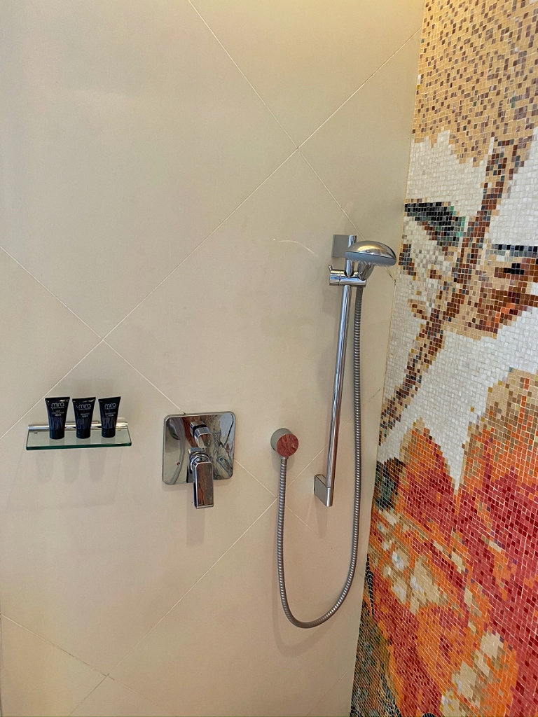 Das Badezimmer bietet eine geräumige Dusche, eine Toilette in einer Glaskabine und eine freistehende Badewanne – sogar mit Nackenrolle. Die Dusche ist ebenfalls in einer Glaskabine und teilt sich eine Glaswand mit der Toilettenkabine. Von daher mag das nicht jedermanns Geschmack treffen. Der Bereich am Waschtisch ist groß genug, die meisten Kulturartikel direkt dort abzustellen. Insgesamt fällt das Bad sehr chic, hell und groß aus. Das geflieste Mosaik an der langen Wand in der Dusche/Toilette sieht dabei spektakulär aus und macht deutlich, dass es sich um ein Design Hotel handelt.