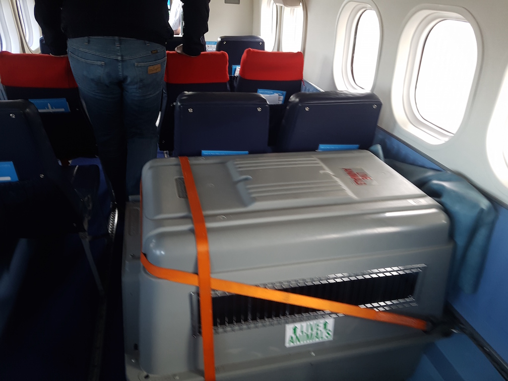 Wer hatte denn da auf dem Rückflug seinen Kläffer mitgebracht? (In der grauen Transportkiste)