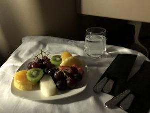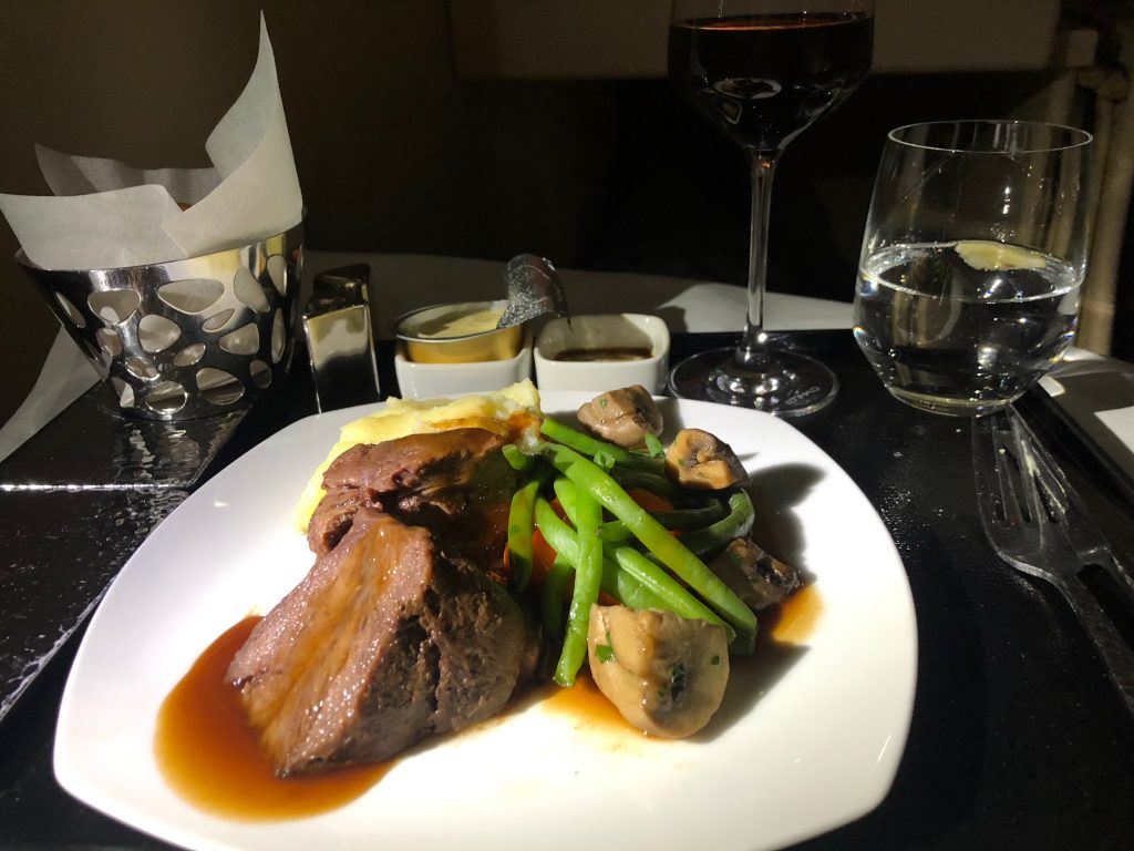Etwas später wurde meinem Wunsch entsprechend die Menüfolge serviert, Geschmack und Qualität waren wieder überzeugend gut! Leider war jetzt auch schon einer der beiden Rotweine nicht mehr verfügbar, ein Missstand für die Crew sich erneut entschuldigen zu müssen. Da auf diesem Flug die meisten Gäste den Zeitpunkt zum essen individuell gewählt haben, waren die Flugbegleiter sehr konstant in der Kabine unterwegs. Gläser wurden übrigens immer leer gebracht und in einem separaten Gang vor dem Gast eingeschenkt.