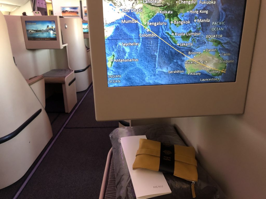 Es war noch etwas Zeit bis sich die Maschine in Bewegung setzte, die Crew schenkte Champagner nach, der Aperitif wurde auch schon abgefragt. Speisekarten und Amenity Kit waren auch diesmal am Sitz, manche Airlines übergeben diese persönlich. Auch auf der langen Strecke nach Sydney gab es leider keine Schlafanzüge oder Slipper.