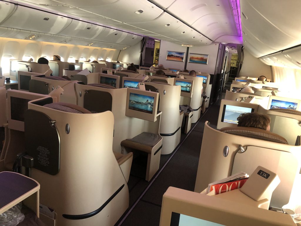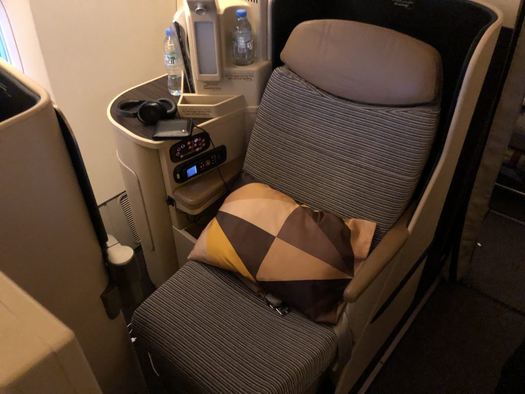 Herzlich wurde ich an Bord der etwas betagten 777 begrüßt und erhielt noch während ich meine Sachen verstaut habe ein Willkommensgetränk. Heiße Tücher wurden verteilt, Amenity Kit und Kopfhörer lagen bereits am Sitz.
