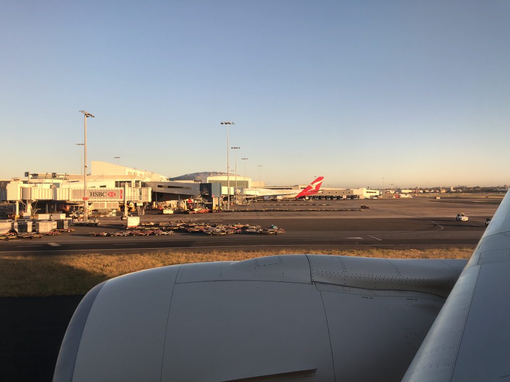 Ich habe zwar noch mitbekommen wie man sich entschuldigte, daß es kein Sprudelwasser mehr gibt, so kurz vor der Landung kann man das aber besser nachvollziehen. 20 Minuten vor der geplanten Zeit sind wir auf dem Kingford Smith Flughafen in Sydney gelandet.