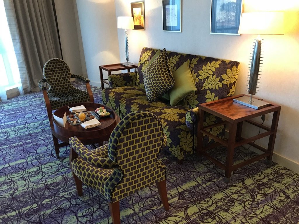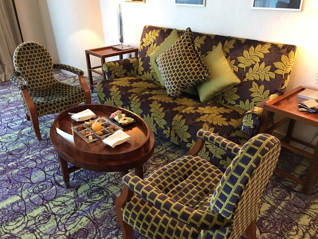 Direkt nach dem Betreten der Suite befand sich auf der linken Seite ein Gäste-WC. Ging man an diesem vorbei, stand man in dem großen Wohnzimmer. Auf der linken Seite befand sich eine kleine Küchenzeile, auf der die Kaffee- und Teestation mit Wasserflaschen untergebracht war. Unten im Schrank war noch eine gefüllte Minibar eingebaut.