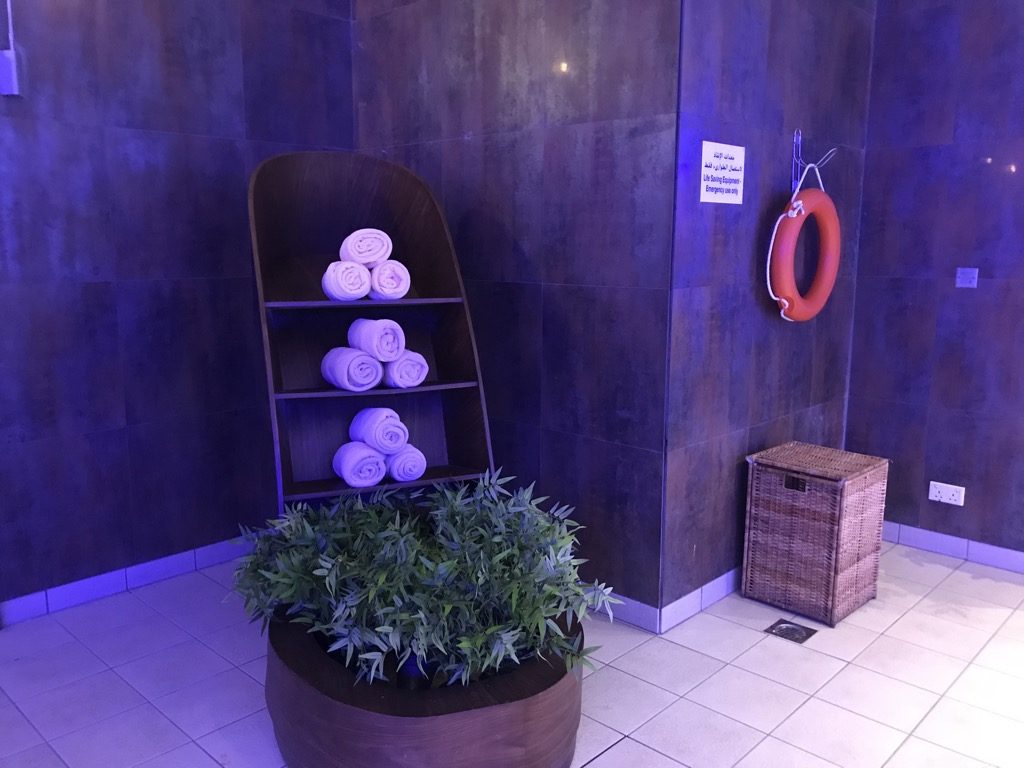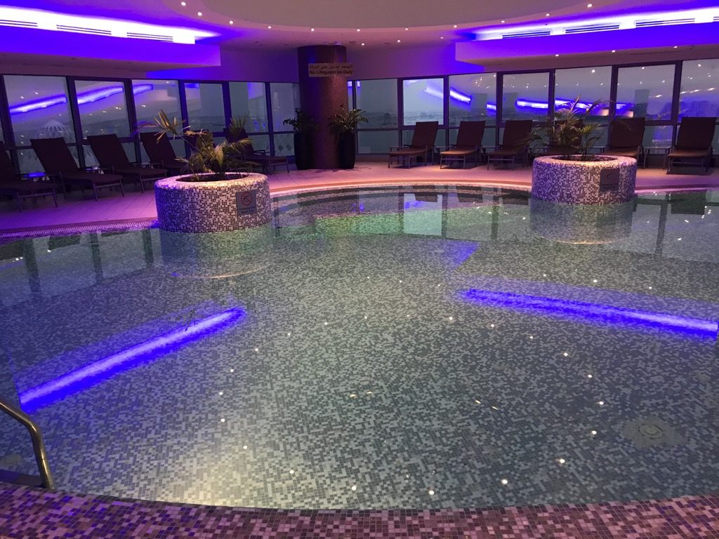 Auf dem obersten Stockwerk befand sich der schön gestaltete Innenpool. Hier war der Ausblick noch beeindruckender als aus unserem Zimmer auf dem 17. Stockwerk. Der Pool hatte eine angenehme Wassertemperatur und die komplette Beleuchtung des Raumes war in einem warmen Licht gehalten. Um den Pool herum standen einige Liegen und Handtuchständer. Zu den Pool Öffnungszeiten war immer ein Angestellter in der Nähe der das Areal in einem einwandfreien Zustand hielt.