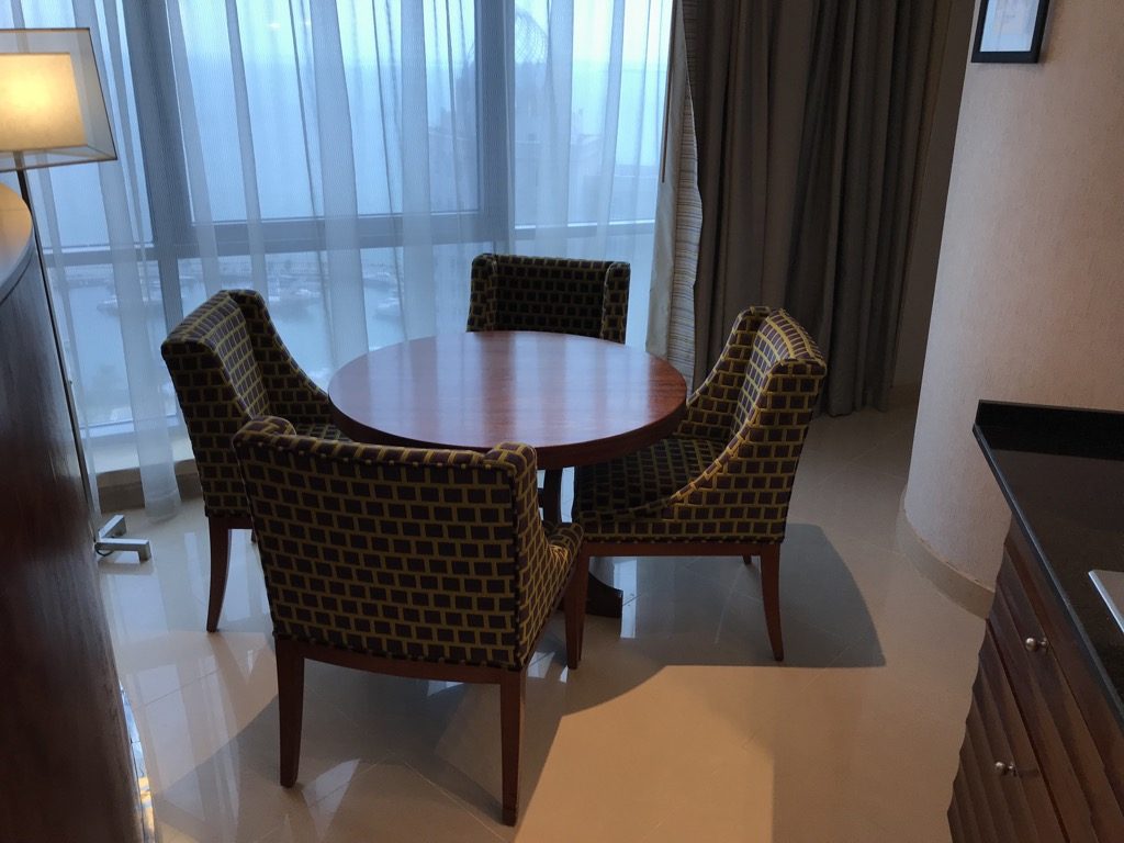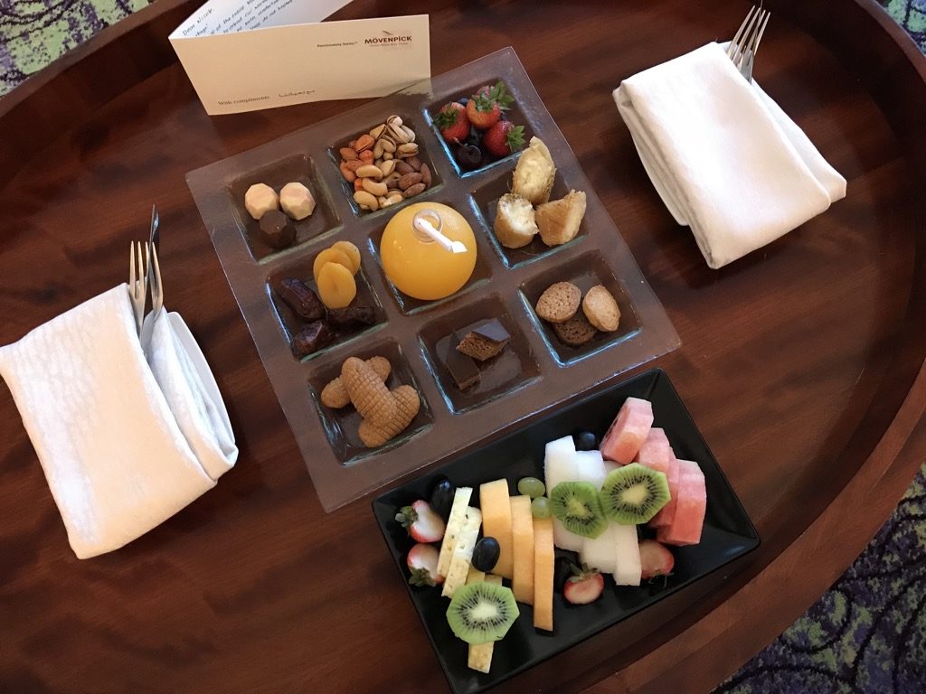 Rechts an der Wand befand sich noch eine Sitzecke mit verschiedenen Couchmöbeln und einem großen Couchtisch. Auf dem Couchtisch begrüßte uns ein Brief und eine tolle Zusammenstellung aus Obst, Nüssen, Schokolade, Saft und arabischen Spezialitäten. Darüber haben wir uns natürlich sehr gefreut.
