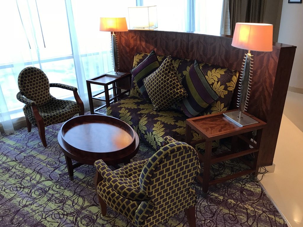 Am Rand der Hotellobby wurden wir an der Rezeption von einer sehr freundlichen Mitarbeiterin begrüßt und eingecheckt. Unsere Daten befanden sich schon alle im Computer, weswegen der Check-In Vorgang sehr zügig abschlossen war. Ursprünglich haben wir einen Superior Sea View Room gebucht, bekamen aber schon beim Check-In ein Upgrade auf eine Executive Sea View Suite, worüber wir uns natürlich sehr gefreut haben. Uns wurde der Weg zum Zimmer erklärt, ebenso wie die Frühstückszeiten und der Zugang zum Internet.