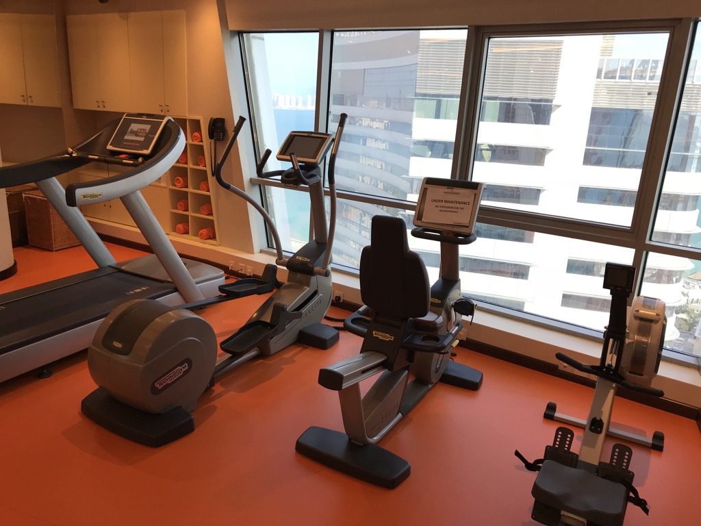 Auf dem selben Stockwerk befand sich auch noch das gemischte Gym, welches erstaunlich groß und gut ausgestattet war. Neben vielen verschiedenen Cardiogeräten war auch noch eine ordentliche Auswahl an Kraftgeräten und freien Gewichten, sowie einer Multipresse vorhanden. Hier hat uns einzig und alleine der Wasserspender etwas gestört. In einem Gym ständig sein Training unterbrechen zu müssen um etwas zu trinken finden wir anstrengend. Hier bevorzugen wir definitiv kleine Flaschen. Bei unserem zweiten Training haben wir einfach leere Flaschen aus dem Zimmer mitgenommen und dort befüllt.
