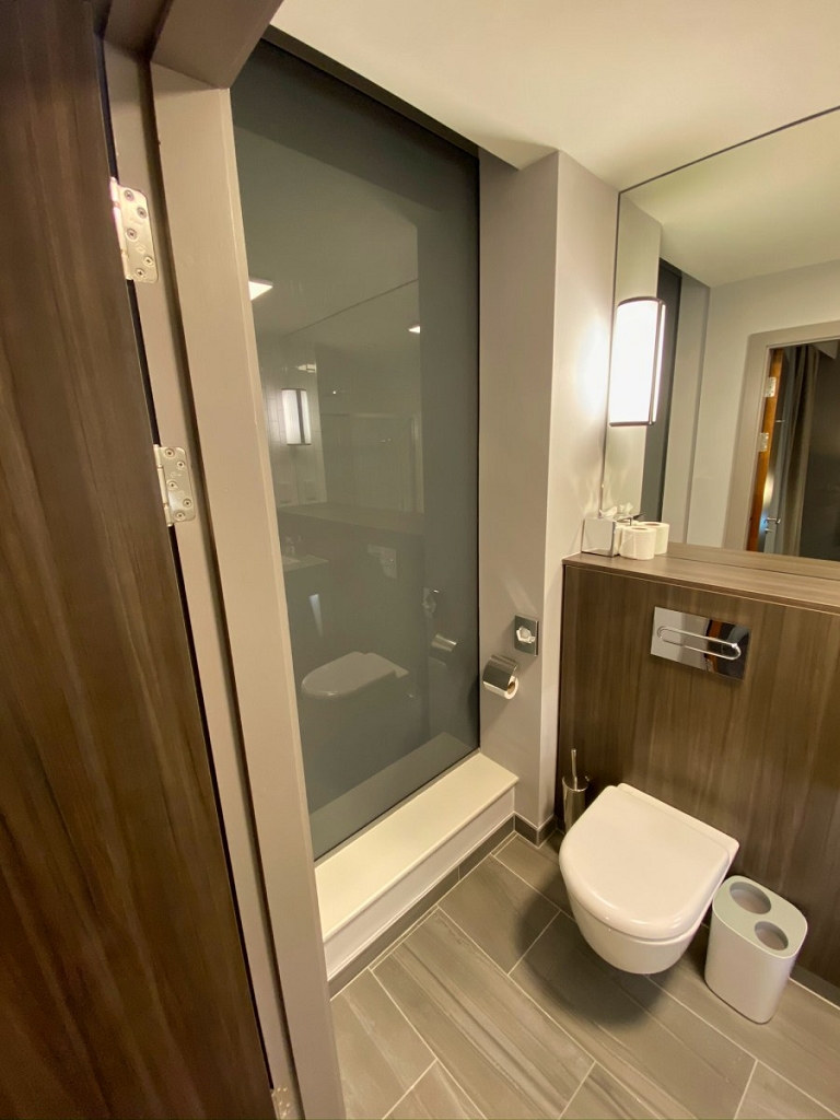 Im Bad war ich dann etwas irritiert, denn die Außenwand sah aus, wie eine übersprühte Glasscheibe. Direkt neben der Scheibe befindet sich dann die Toilette und die Dusche ist frontal zu der Fensterscheibe ausgerichtet. Da es draußen schon dunkel war, konnte ich mir keinen Eindruck verschaffen, wie blickdicht die Scheibe wohl wäre. Nach dieser kurzen Irritation beschloss ich, dass jeder der gucken würde dieses auf eigene Gefahr tun müsse. Es gäbe sicherlich schönere Anblicke als mich im Bad. Am nächsten Morgen konnte ich die Zweifel übrigens zerstreuen – die Scheibe ist vollständig blickdicht, aber noch leicht lichtdurchlässig. Alles in Ordnung.