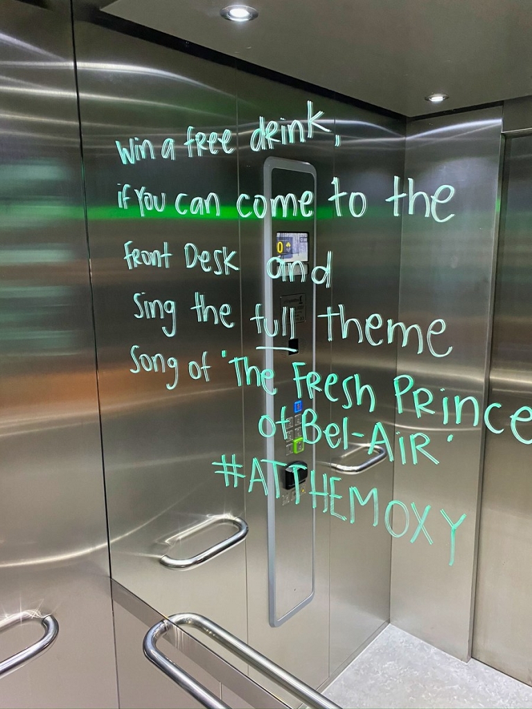 Im Aufzug gibt es eine tägliche Challenge, mit der man Freigetränke gewinnen kann. Dafür muss man dann z.B. am Frontdesk den Titelsong vom Fresh Prince of Bel Air rappen. Als Reward darf man dann ein Getränk aus dem Kühlschrank nehmen, jedoch keinen Prosecco oder Champagner. Ist irgendwie ganz witzig, wird wohl aber nicht so oft in Anspruch genommen. Aber ich musste es als gewissenhafter Reviewer natürlich ausprobieren. Es funktioniert.