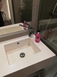 Auch bei den Badezimmern im Moxy London Heathrow gibt es quasi keinen Unterschied zu anderen Moxy Hotels. Hier findet man ein kleines Waschbecken, eine Dusche und die Toilette.