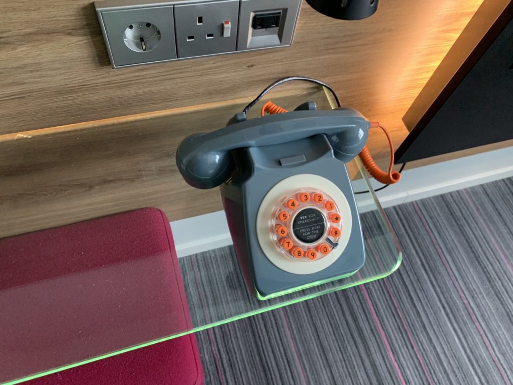 An der Wand findet man noch eine Art Glasschreibtisch. Dieser ist allerdings recht schmal und zum Arbeiten eigentlich zu klein. Das Telefon mit Wählscheibe fand ich allerdings wiederum eine lustige Idee.