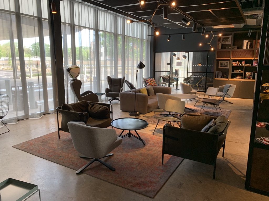 Die Lobby des Moxy Lodon Heathrow ist überraschend groß und dient als Aufenthaltsraum für das Hotel. So hat man hier am Abend durchaus einige Leute noch arbeiten oder einfach relaxen gesehen.