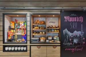 Wie in den anderen Moxy-Hotels findet der Check-in an einer Bar statt. Dort bekommt man rund um die Uhr Getränke und Snacks. Diese werden wie in einem Kiosk präsentiert, es gab auch Fertiggerichte und eine Mikrowelle.