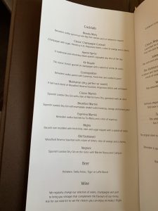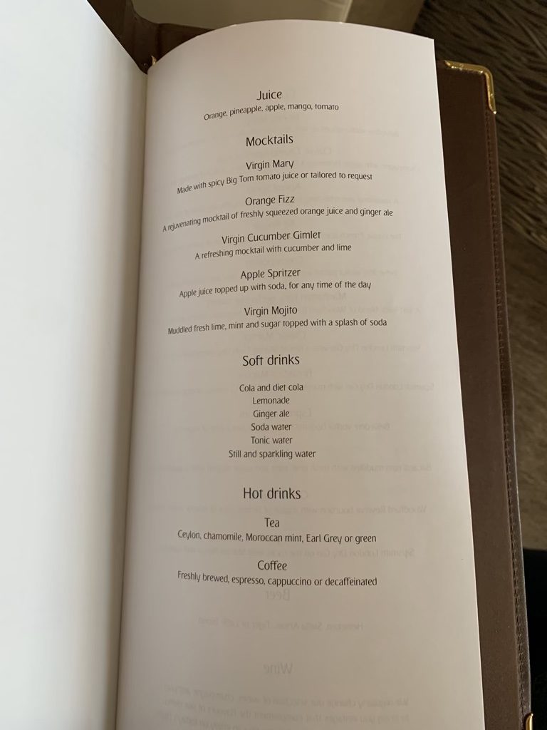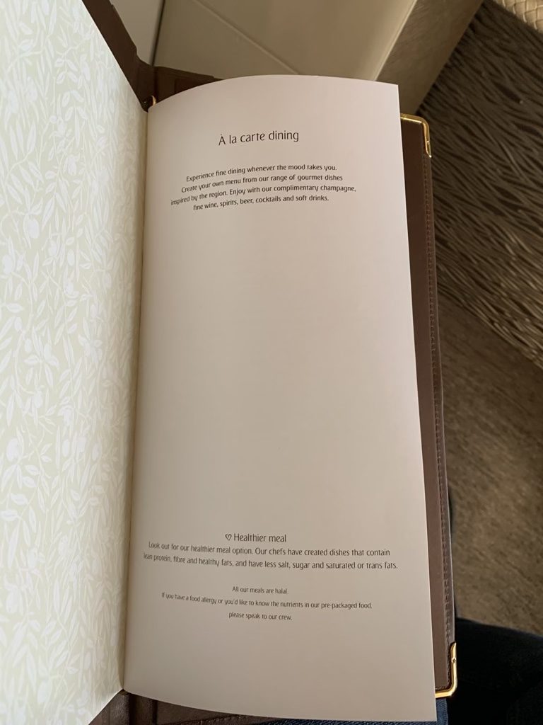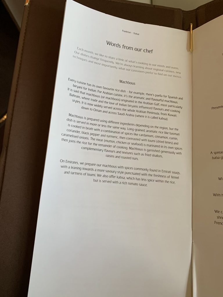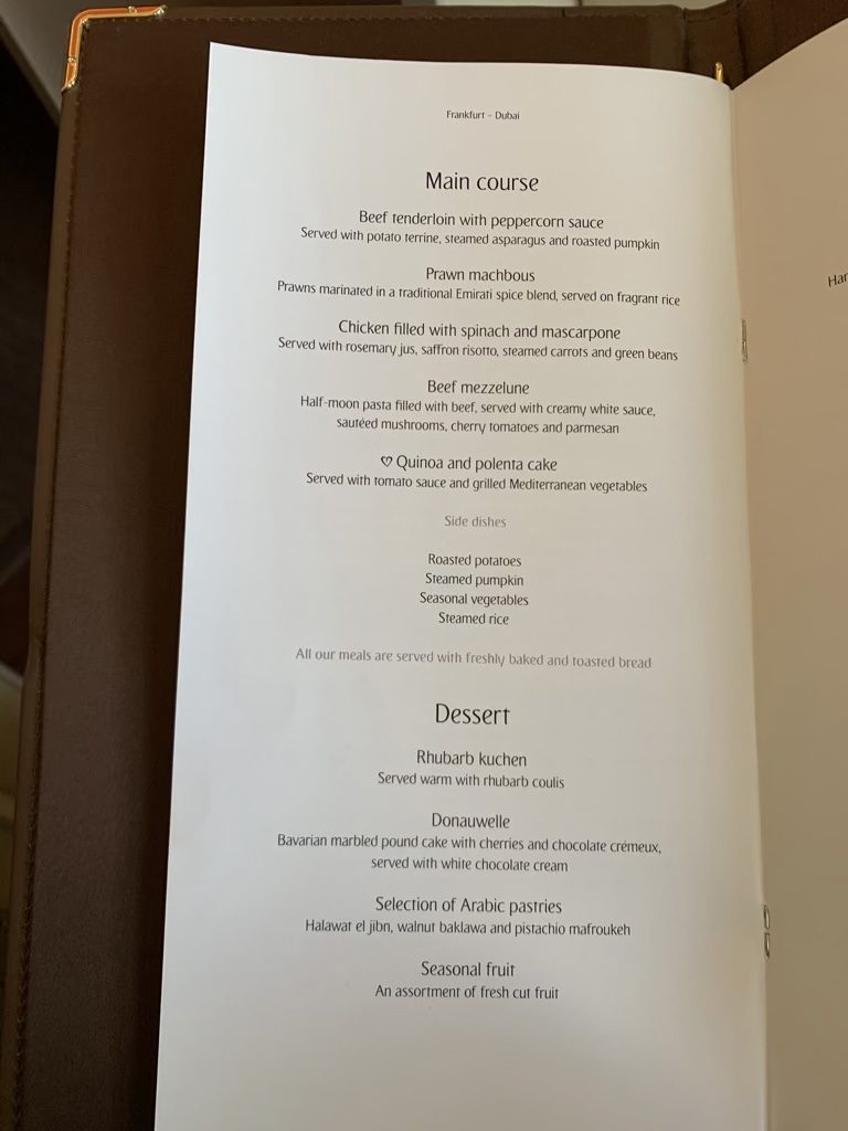 Zehn Minuten später wurde mein Glas noch einmal aufgefüllt und man überreichte mir die Speisekarte. Emirates hat in der First Class ein Dine on Demand Konzept, bei welchem man jederzeit aus der Karte bestellen kann, was man möchte. Nachdem es Mittagszeit war, haben wir uns darauf verständigt, dass ich gerne direkt nach dem Start essen wollte und man hat meine Bestellung gerne, zusammen mit den Worten, dass man etwa zehn bis 15 Minuten für die Vorbereitung benötigen würde, aufgenommen.