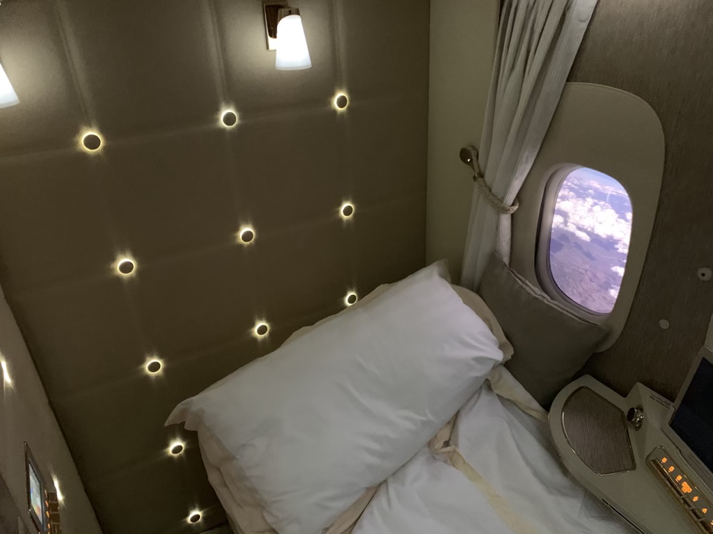 Emirates legt eine dicke Matratze auf den Sitz und stattet ihn mit einem großen Kissen und einer sehr kuschligen Decke aus. Damit war das Bett so bequem, dass ich sogar fast eine Stunde geschlafen habe.