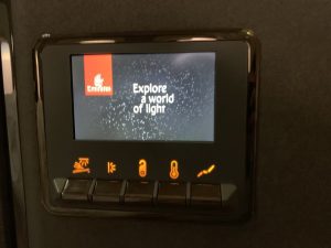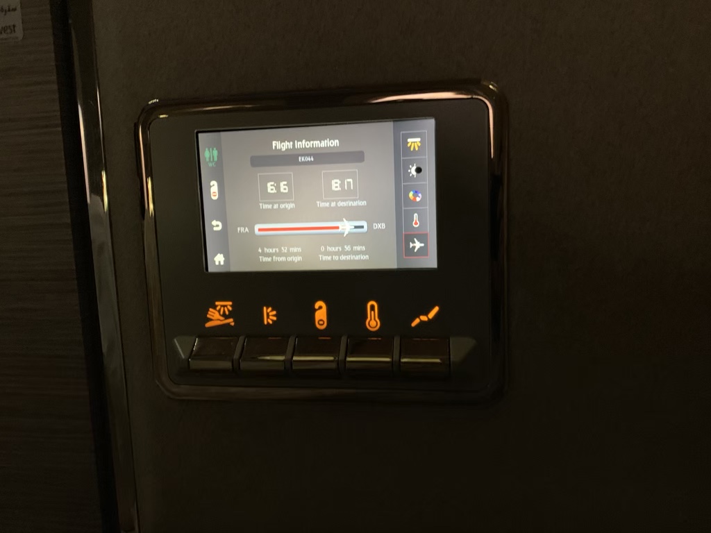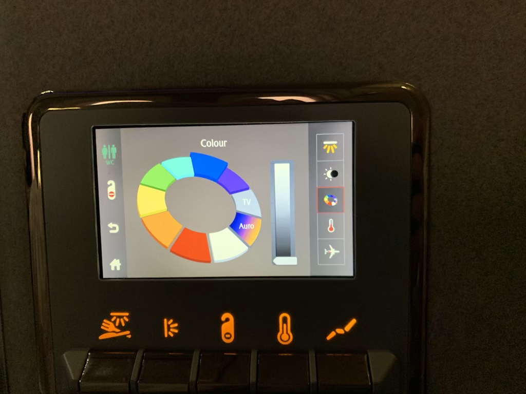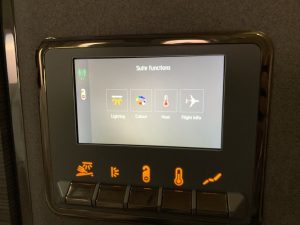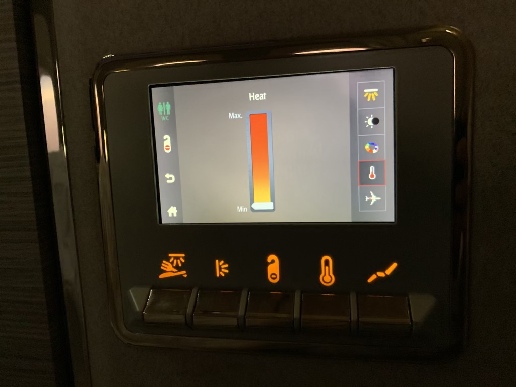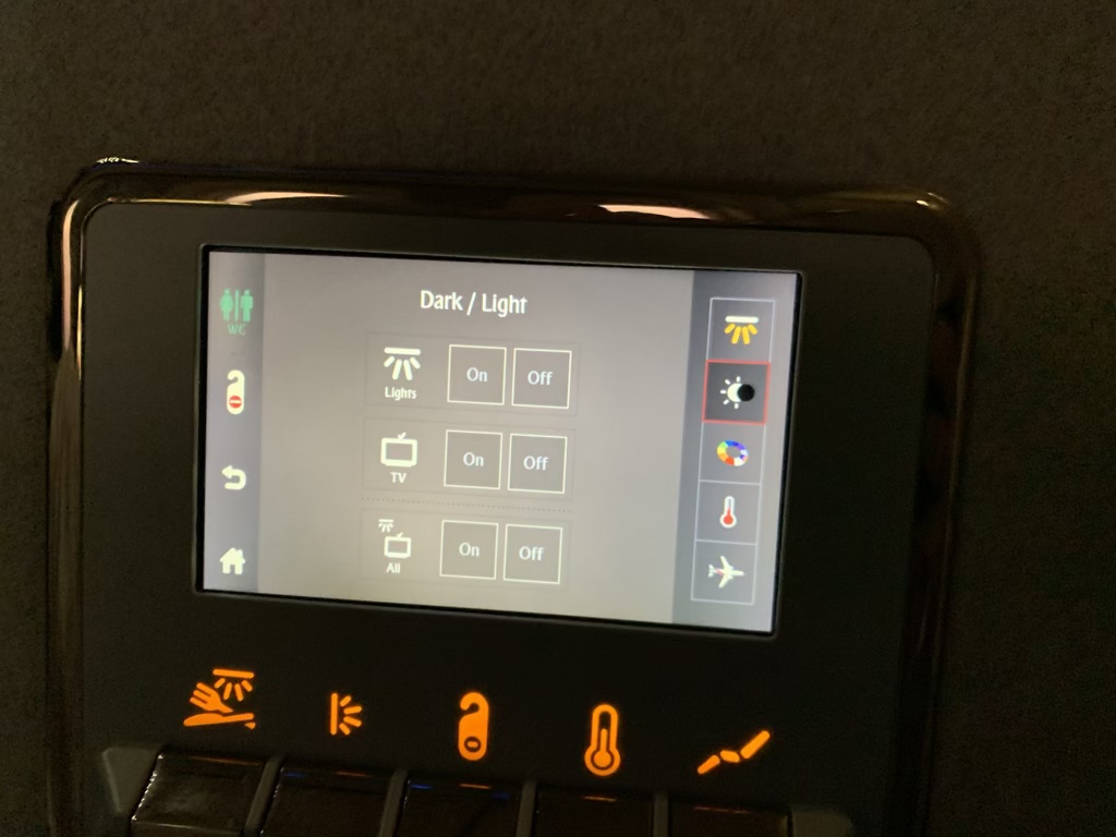 An der Wand links neben dem Sitz befand sich ein weiterer kleiner Bildschirm, mit welchem man die „Atmosphäre der Suite“ selbst kontrollieren konnte. So konnte man hier neben diversen verschiedenen Lichtern und Farben auch die Temperatur in der Suite regeln.