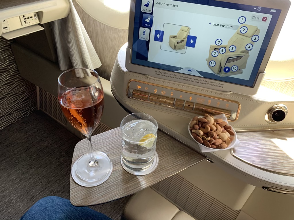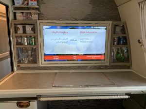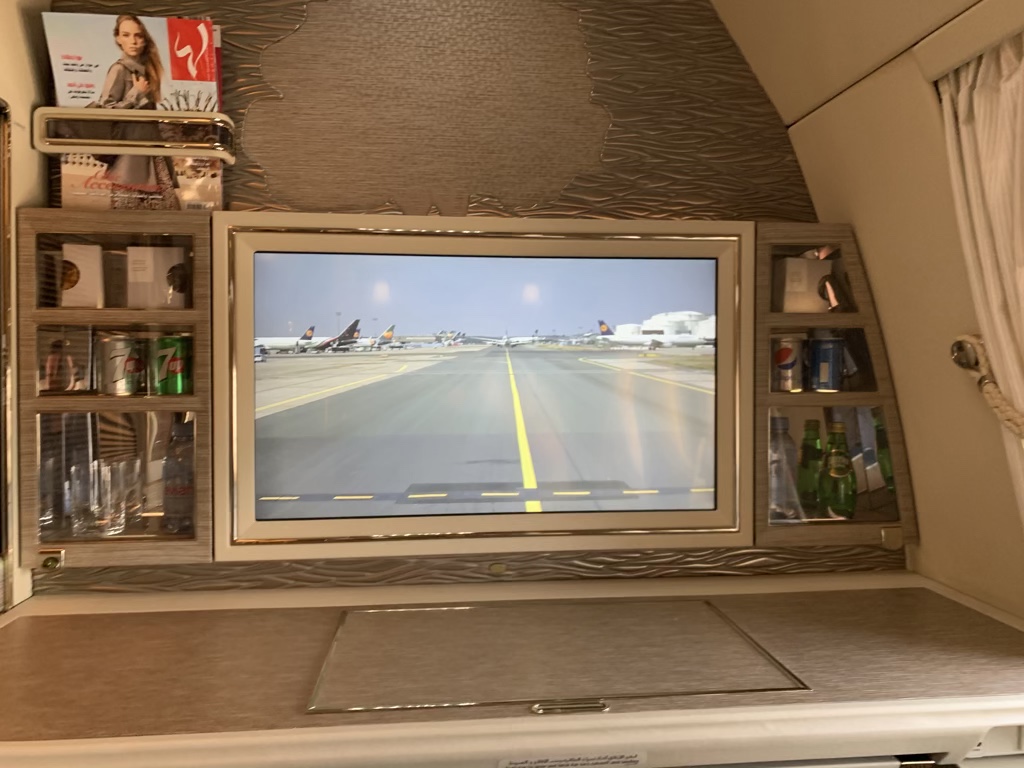 Als wüsste Emirates dies, befindet sich die individuelle Minibar nun links und rechts neben dem riesigen Monitor.