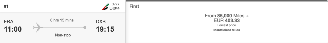 Ich habe meinen Flug in der neuen Emirates First Class mit Skywards Meilen, also mit den Meilen aus dem Vielfliegerprogramm von Emirates gebucht. Hierbei habe ich 85.000 Meilen und 403 Euro an Steuern und Gebühren bezahlt, was sicher nicht günstig ist, aber für das Erlebnis neue Emirates First Class war es mir die Investition wert.