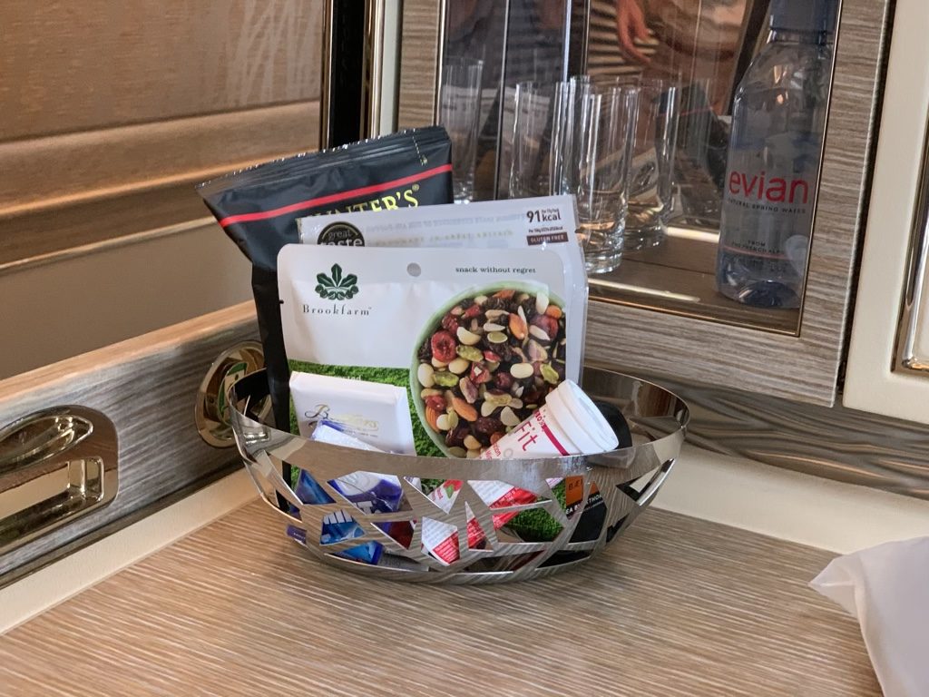 Vor dem Start brachte man mir auch schon den Snackkorb, welchen man auch während dem Flug immer in der Suite stehen hat und in welchem man allerhand kleiner Süßigkeiten und Snacks findet.