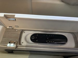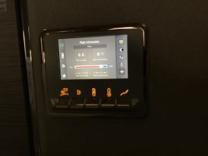 Rechts neben dem Sitz befand sich eine Seitenkonsole, auf welcher das „Suite Pad“ installiert war. Dieses konnte man nach dem Start auch herausnehmen und neben dem IFE auch den ganzen Sitz und alle Lichter der Suite kontrollieren.