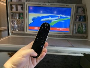 Das IFE kann man in der neuen Emirates First Class entweder über das Suite Pad bedienen, auf welchem man sich beim Film schauen auch die Karte oder die Ausenkameras anzeigen lassen kann oder man nutzt die kabellose Fernbedienung aus der Armlehne.