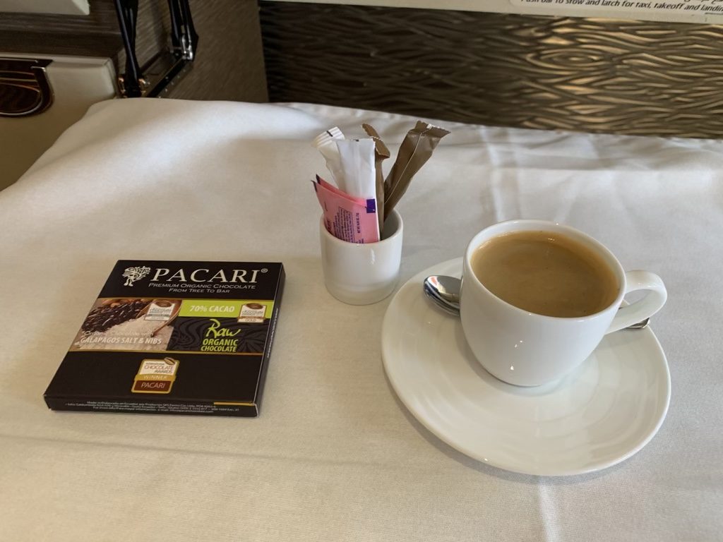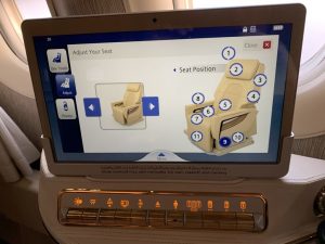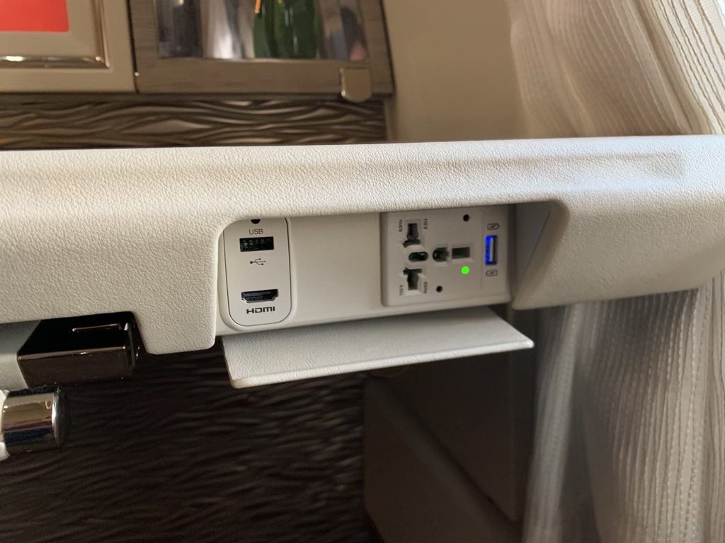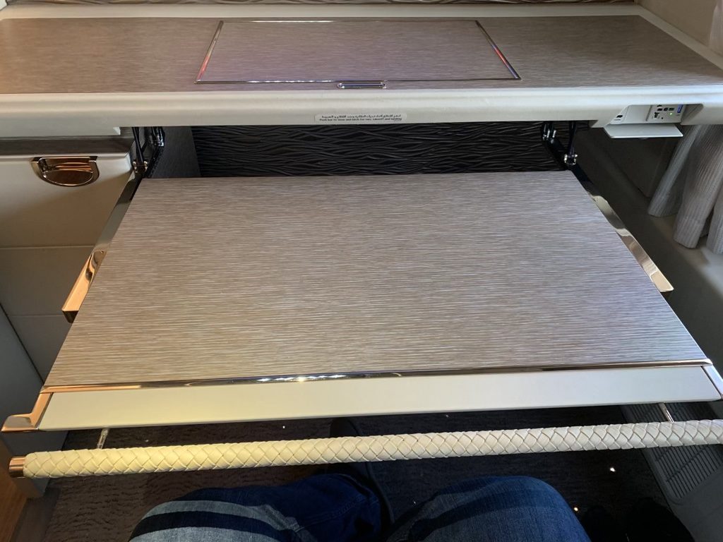 Zum einen war es einfach ein „normaler Sitz“, welcher flach gestellt wurde und nicht ein separates Bett, welches man ausklappt, wie z.B. in der neuen Singapore Airlines Suite. Zum andern verschwand der komplette Fußraum unter einem Tisch, was immer die Frage aufwirft, ob man hier auch wirklich genügend Bewegungsfreiheit hat.