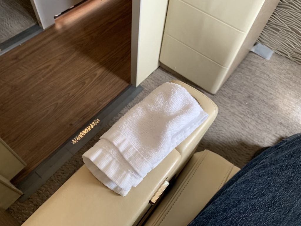 Zusätzlich gab es auch vor dem Start noch ein heißes Tuch, wobei heiß hier auch wirklich ernst zu nehmen war, denn ich musste das dampfende Tuch erst abkühlen lassen, bevor ich es verwenden konnte.