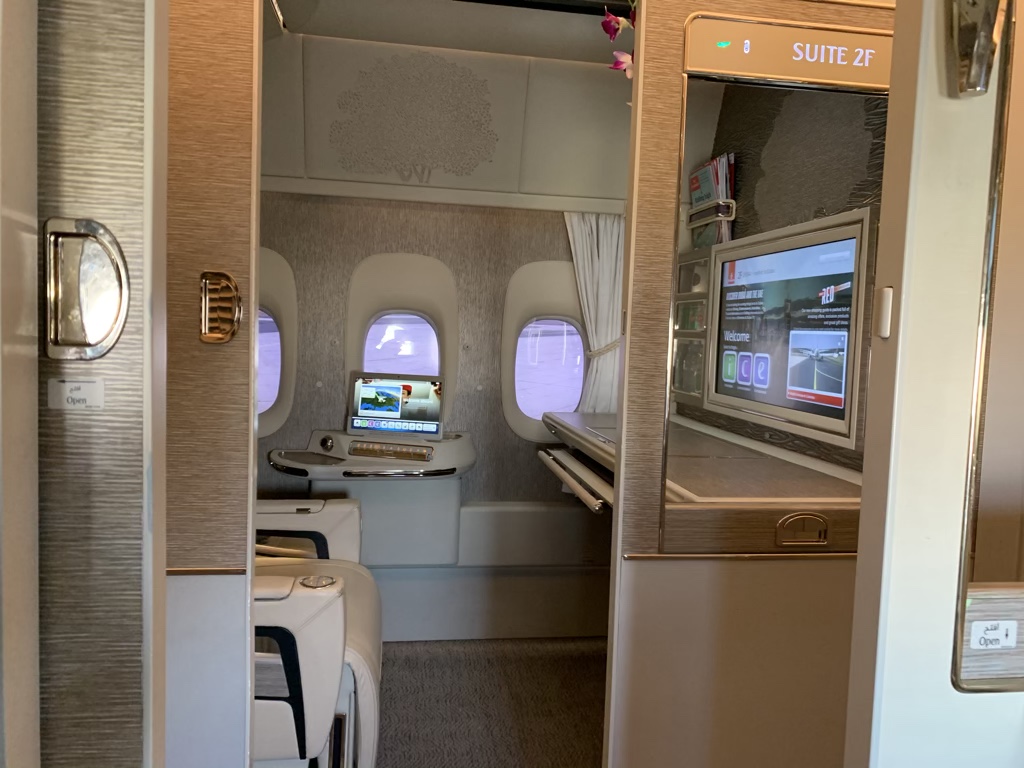 Bei der neuen Emirates First Class in der Boeing 777-300er sollte man wissen, dass es zwei Suiten gibt, bei welchen die Türen gegenüber liegen. Hier kann man bei geöffneter Tür mit dem Nebenmann ein wenig kommunizieren, wobei man sich hier sehr nach vorne lehnen muss. Wenn man mit einem Partner zusammen reist, sind 1A und 1E , sowie 2K und 2F bedingt für Paare geeignet.