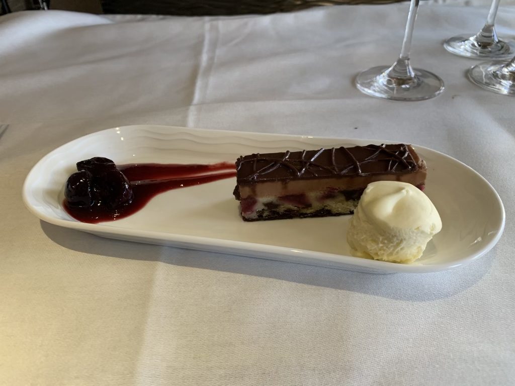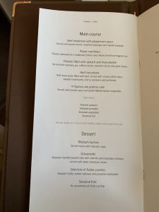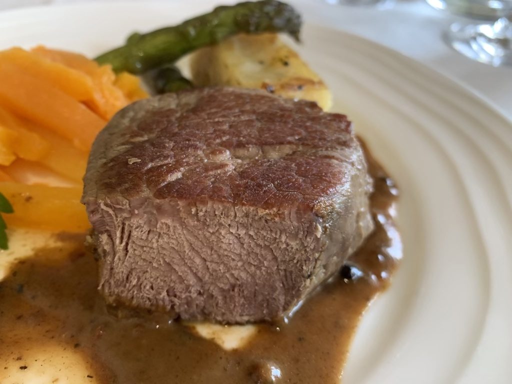Zum Hauptgang habe ich das Rinderfilet bestellt, welches zwar sehr schön anzusehen war, allerdings war es etwas zu lange im Ofen und daher schon durch gegart. Es ist aber auch wirklich schwer, dieses im Flugzeug perfekt zuzubereiten. Geschmeckt hat es trotzdem.
