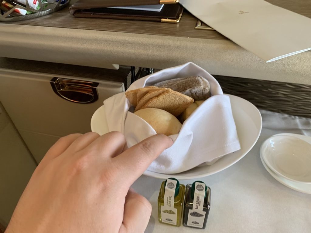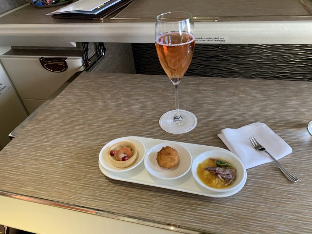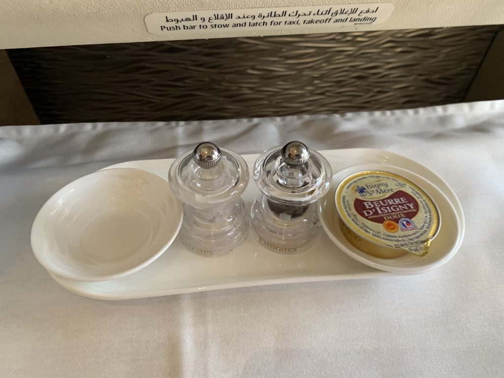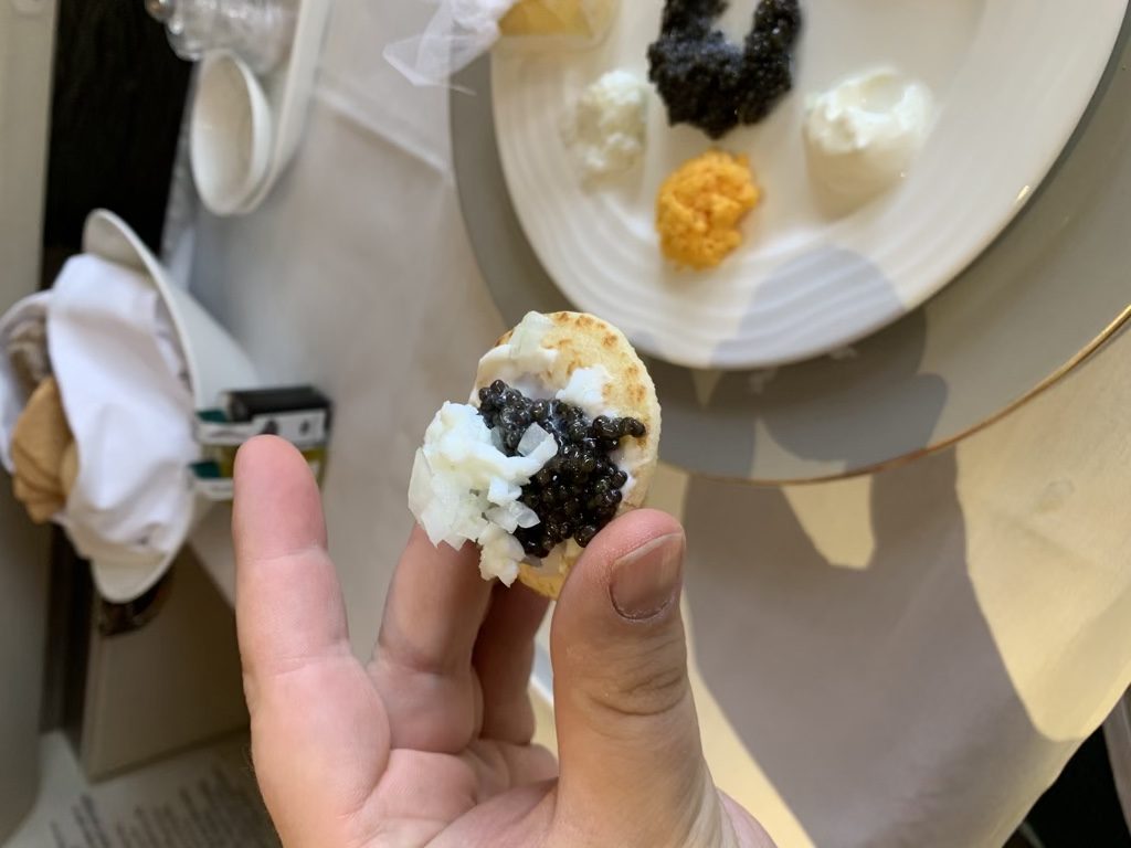 Ich finde die Präsentation des Kaviars bei Emirates immer sehr gelungen und esse ihn sehr gerne. Allerdings muss ich ehrlich gestehen, dass ich einer dieser Banausen bin, der quasi nur im Flugzeug Kaviar isst und das auch gerne, obwohl bei Emirates auch der Perlmutt- oder Plastiklöffel zum Kaviar fehlt.