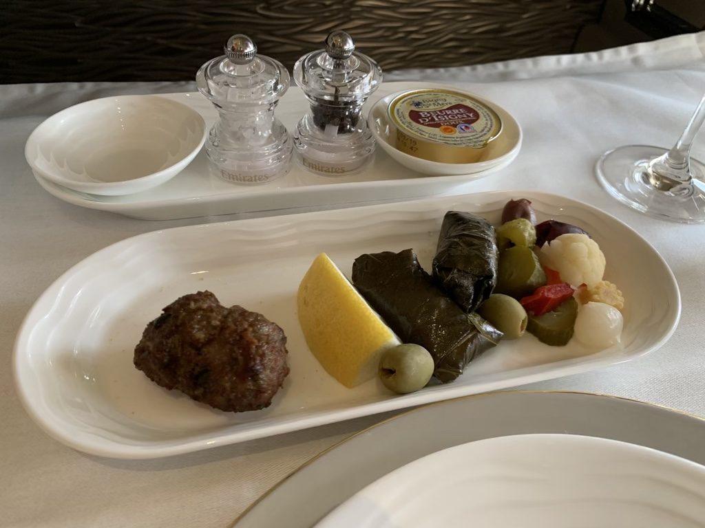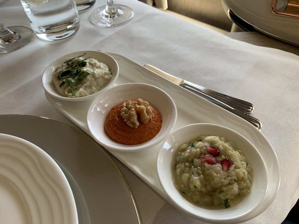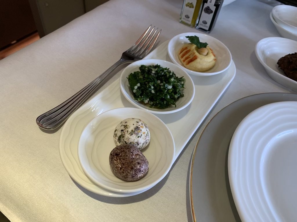 Als zweite Vorspeise habe ich mir die arabische Mezze bestellt, also eine Zusammenstellung von verschiedenen Vorspeisen. Auch wenn man viel zu viel Essen bekommt, finde ich die Art und Weise wie Emirates das Mezze serviert sehr schön und ich habe noch nicht erlebt, dass es eine Airline besser gemacht hat.