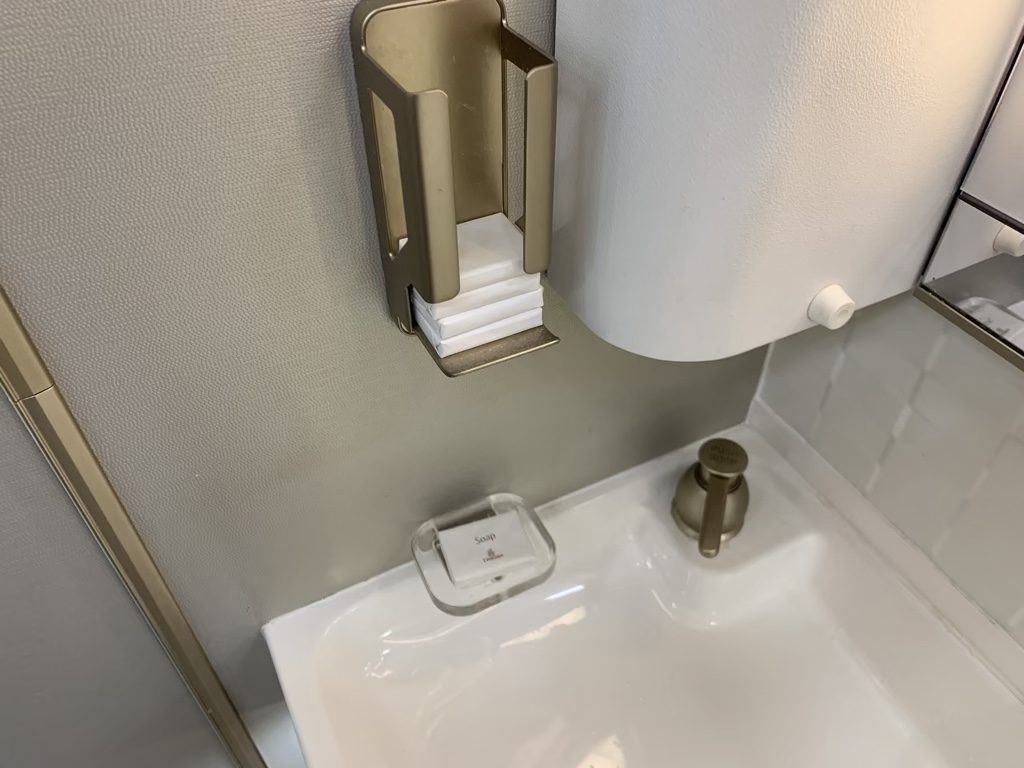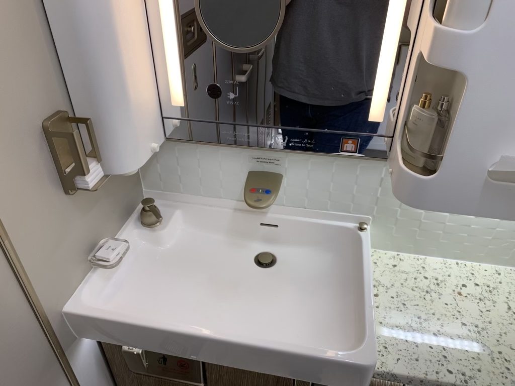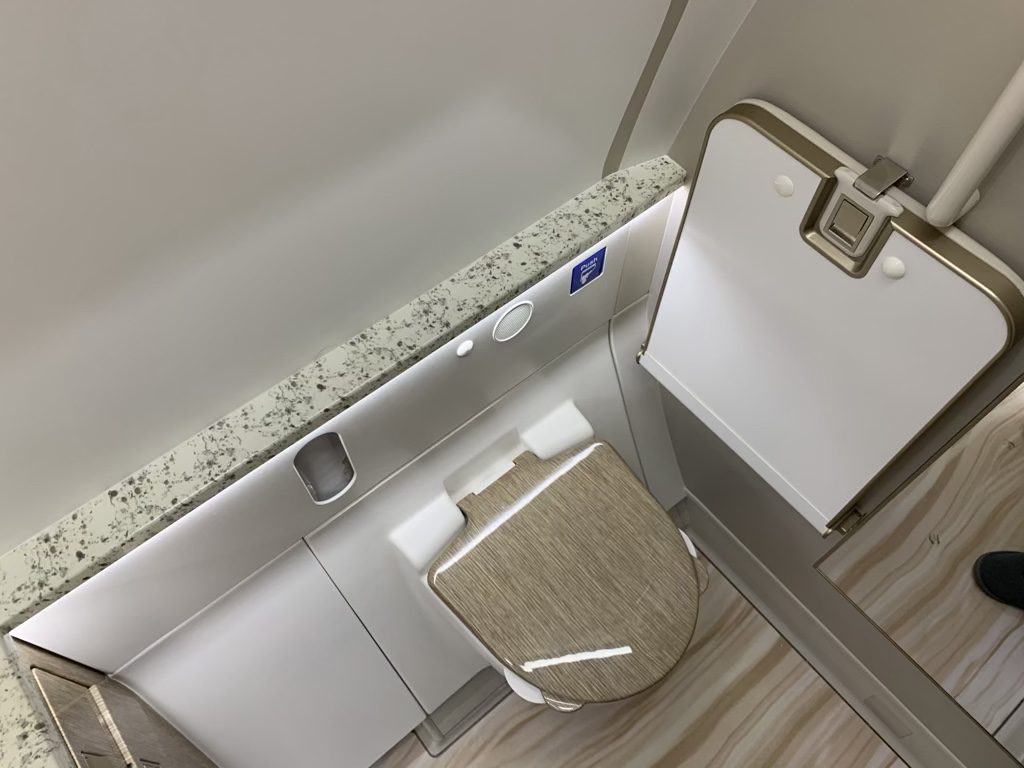 Im vorderen Bereich der Kabine direkt hinter dem Cockpit gibt es in der neuen Emirates First Class für die sechs Passagiere zwei Toiletten. Diese sind allerdings bei weitem nicht so groß wie die im Airbus A380 und auch eine Dusche sucht man hier vergeblich.